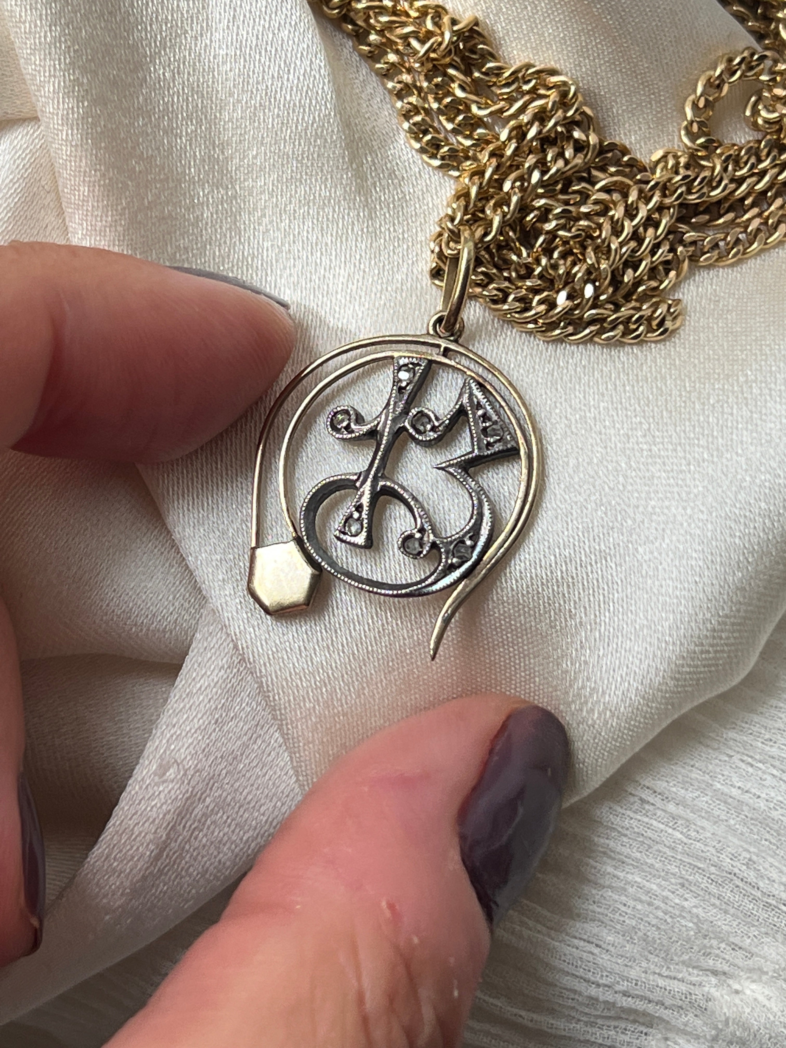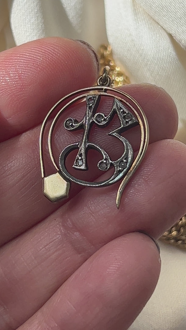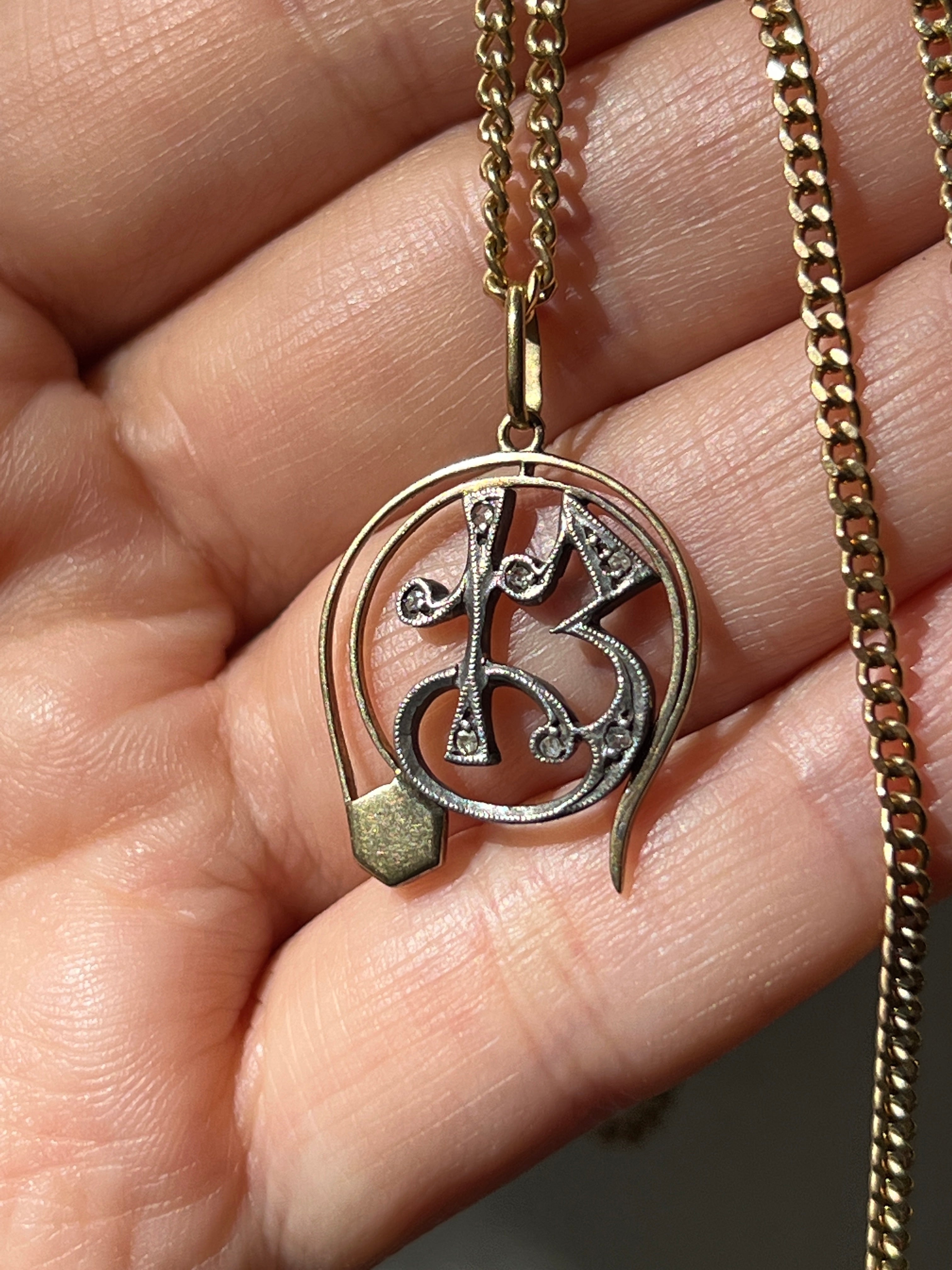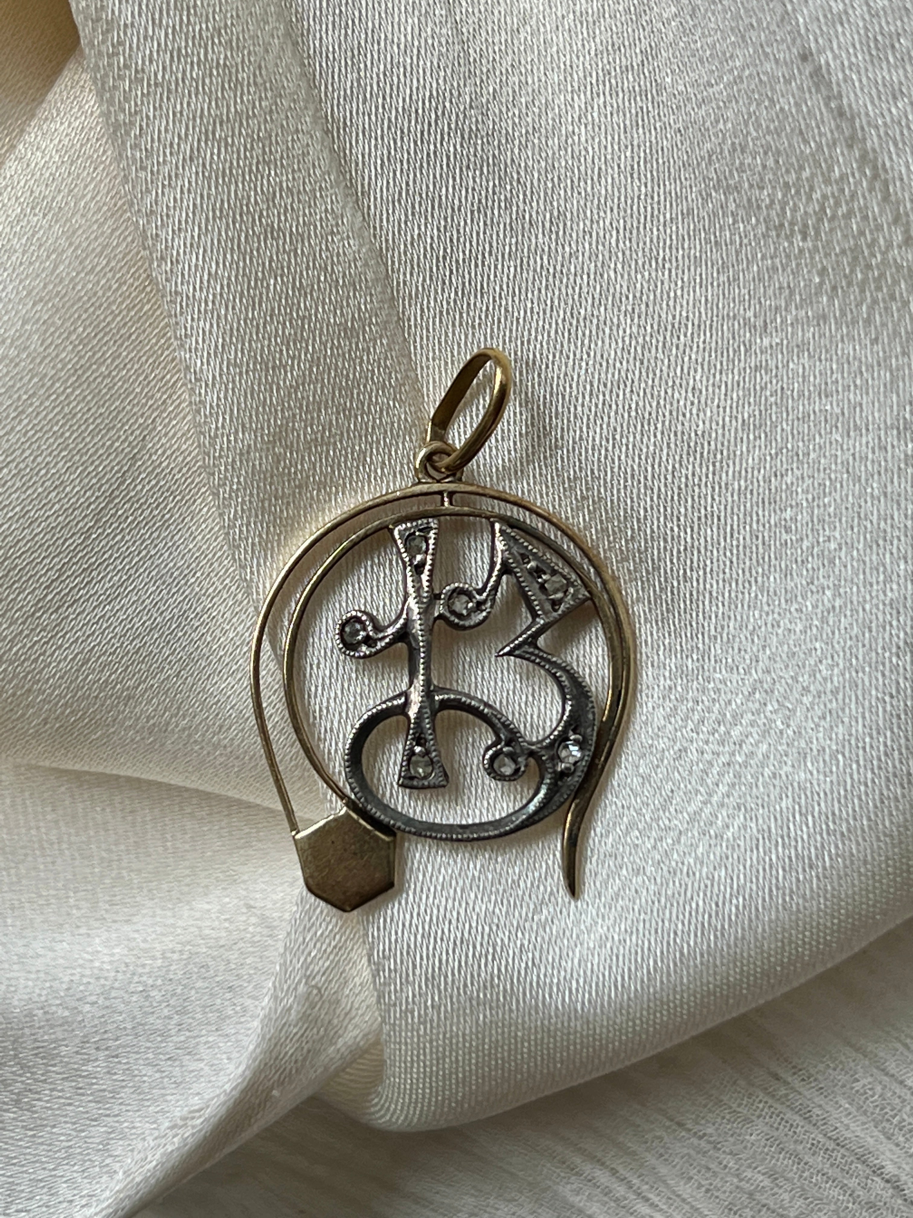 Antique Italian 18k gold and old cut diamond 13 lucky pendant in a horseshoe shape for double luck.