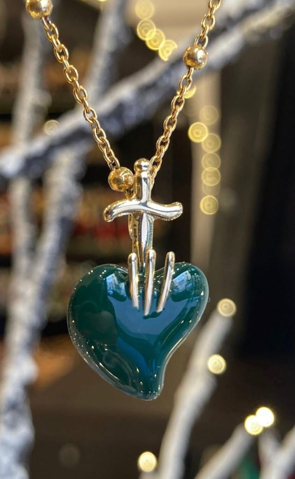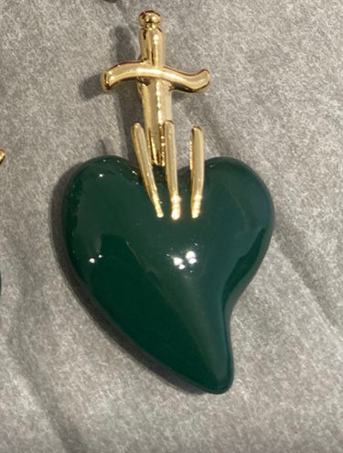 Italian Gold and Green Enamel Heart Pendant. The history of this piece is connected to the culture and tradition of South Italy. The holy heart symbolizes love and passion. The heart is made in green enamel and the top part is crafted in 18k gold plated on sterling silver.  The heart measures 1 by 0.6 inch.