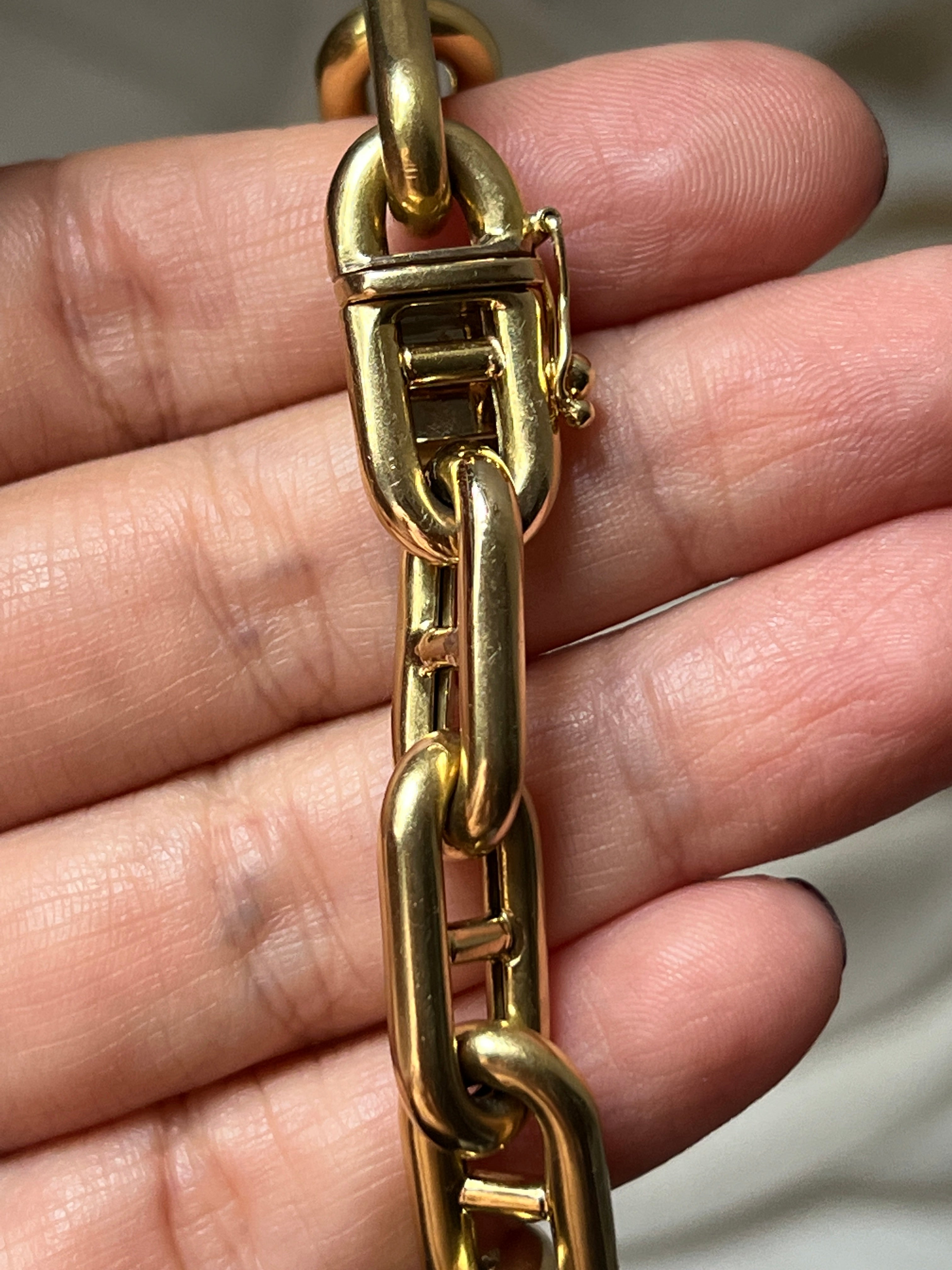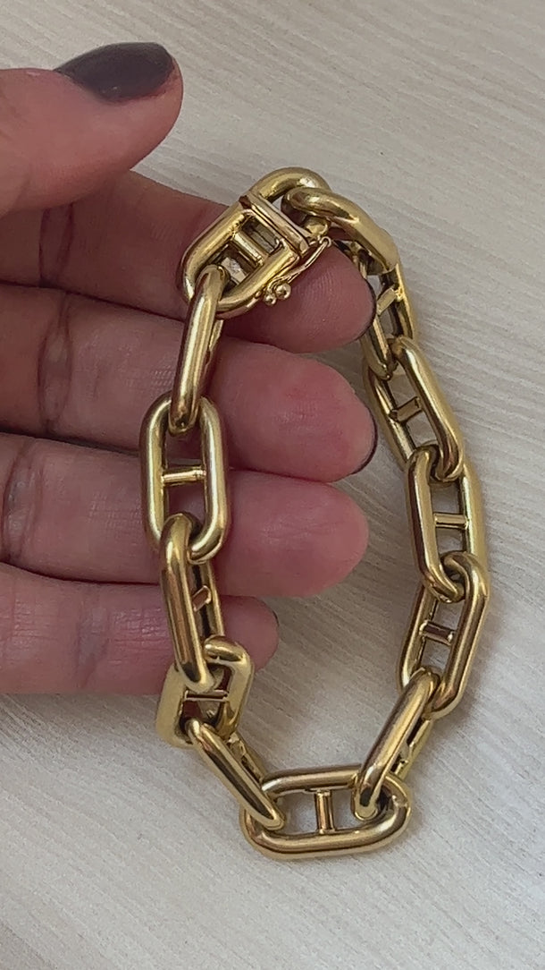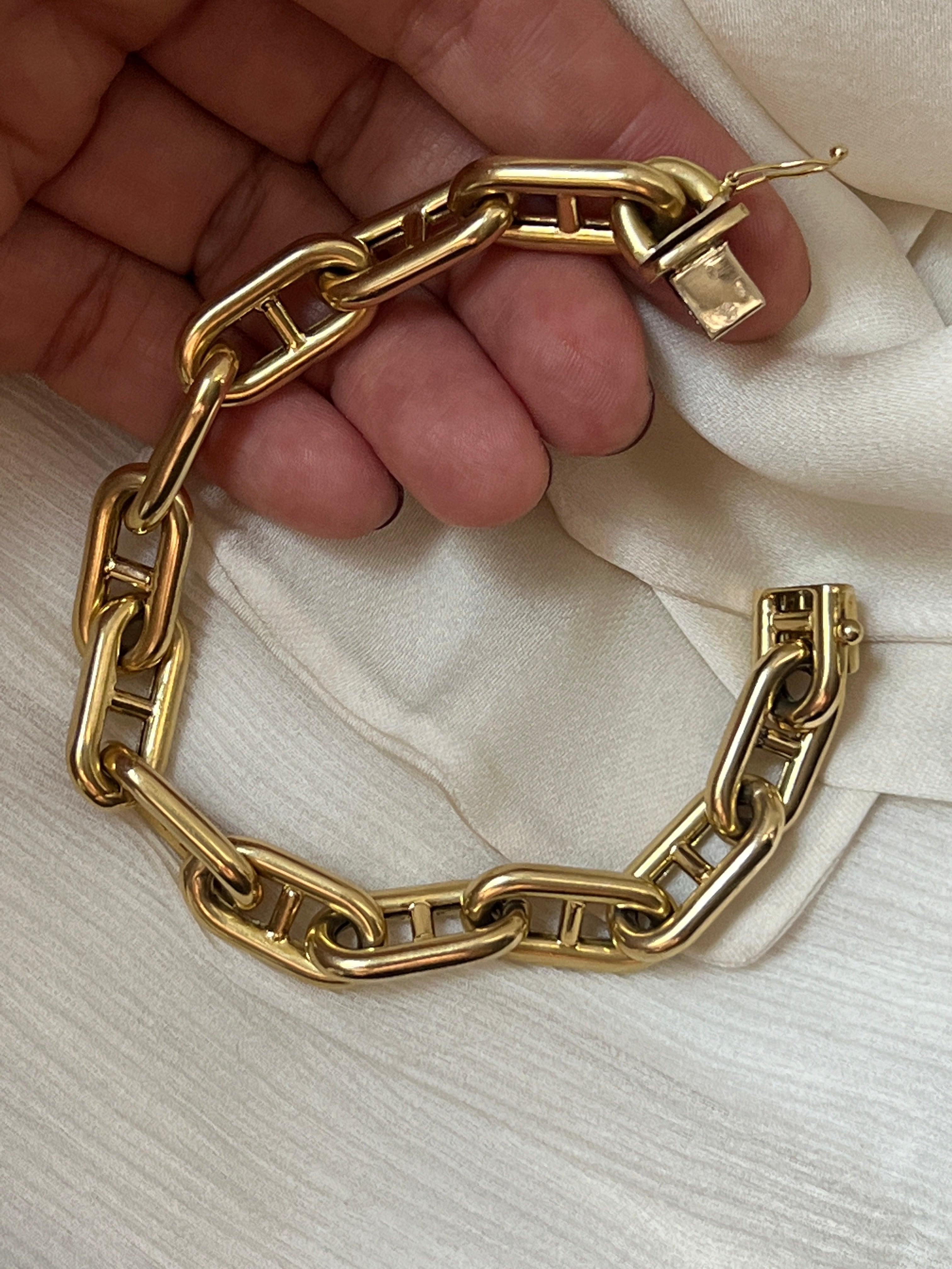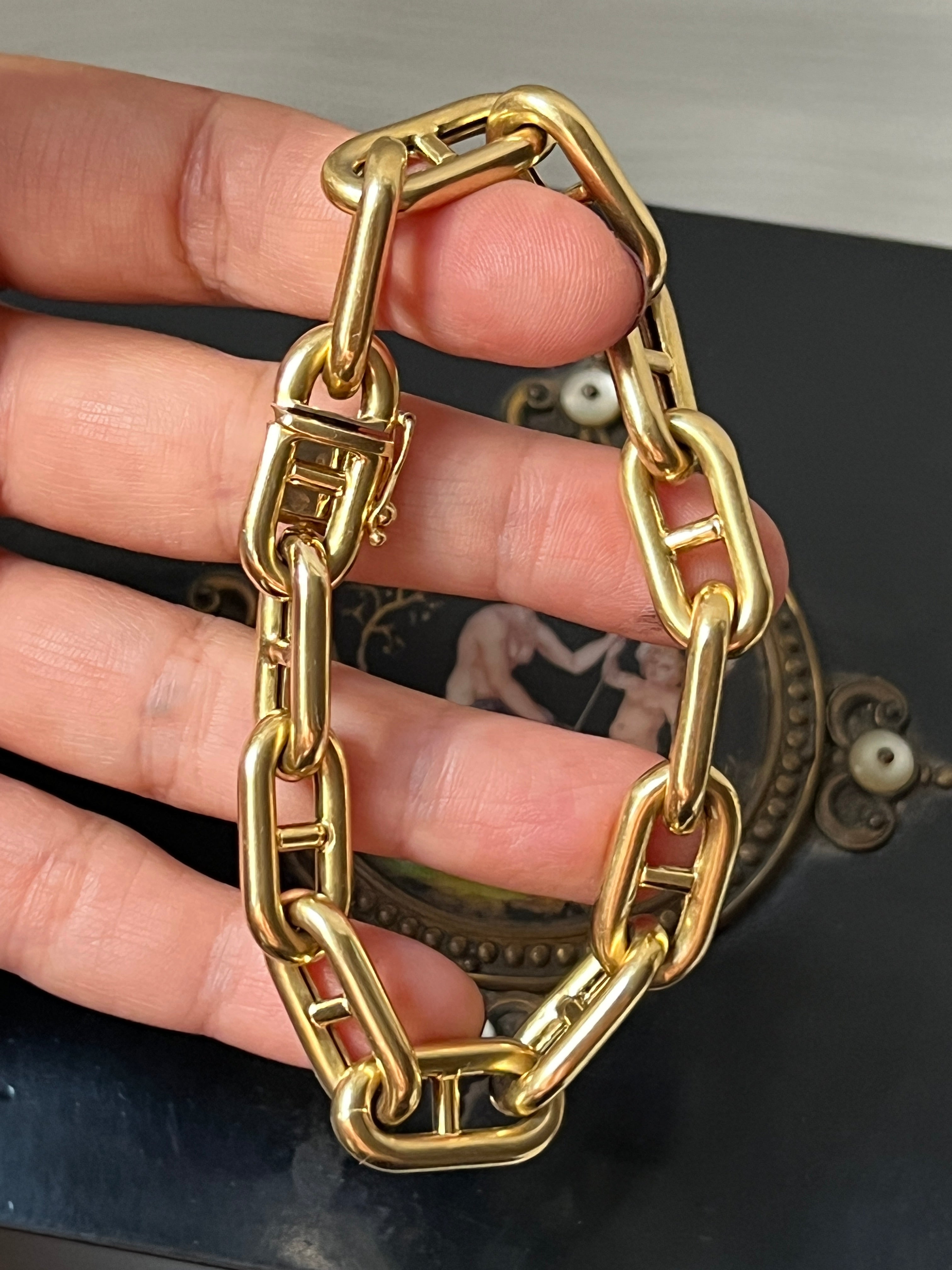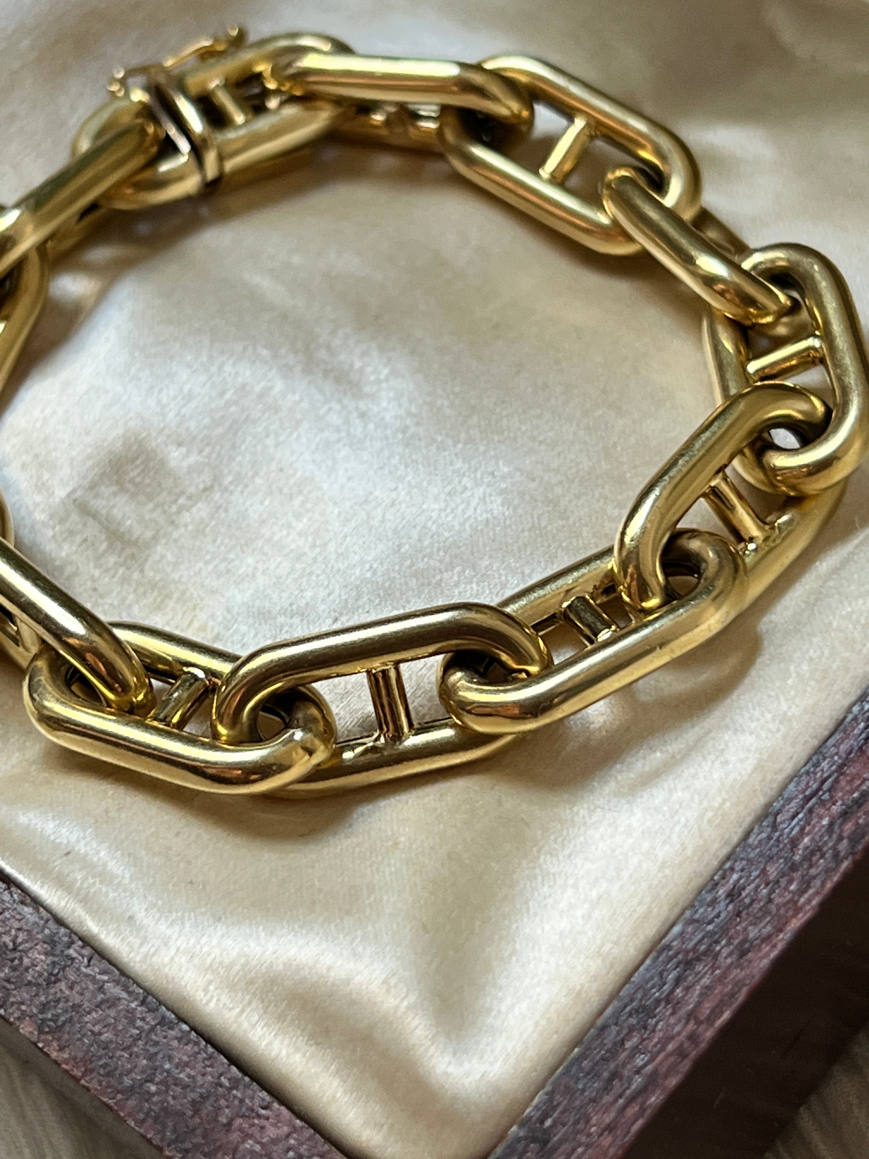 Vintage French 18k gold mariner link bracelet. This bracelet is made in 18k buttery gold with chunky mariner link (10mm width). It has a hinged closure with a safety on one side. It measures 7.6 inches. It is hallmarked with a french eagle head hallmark and the makers initials GLLC. It was made in the 70s in France.