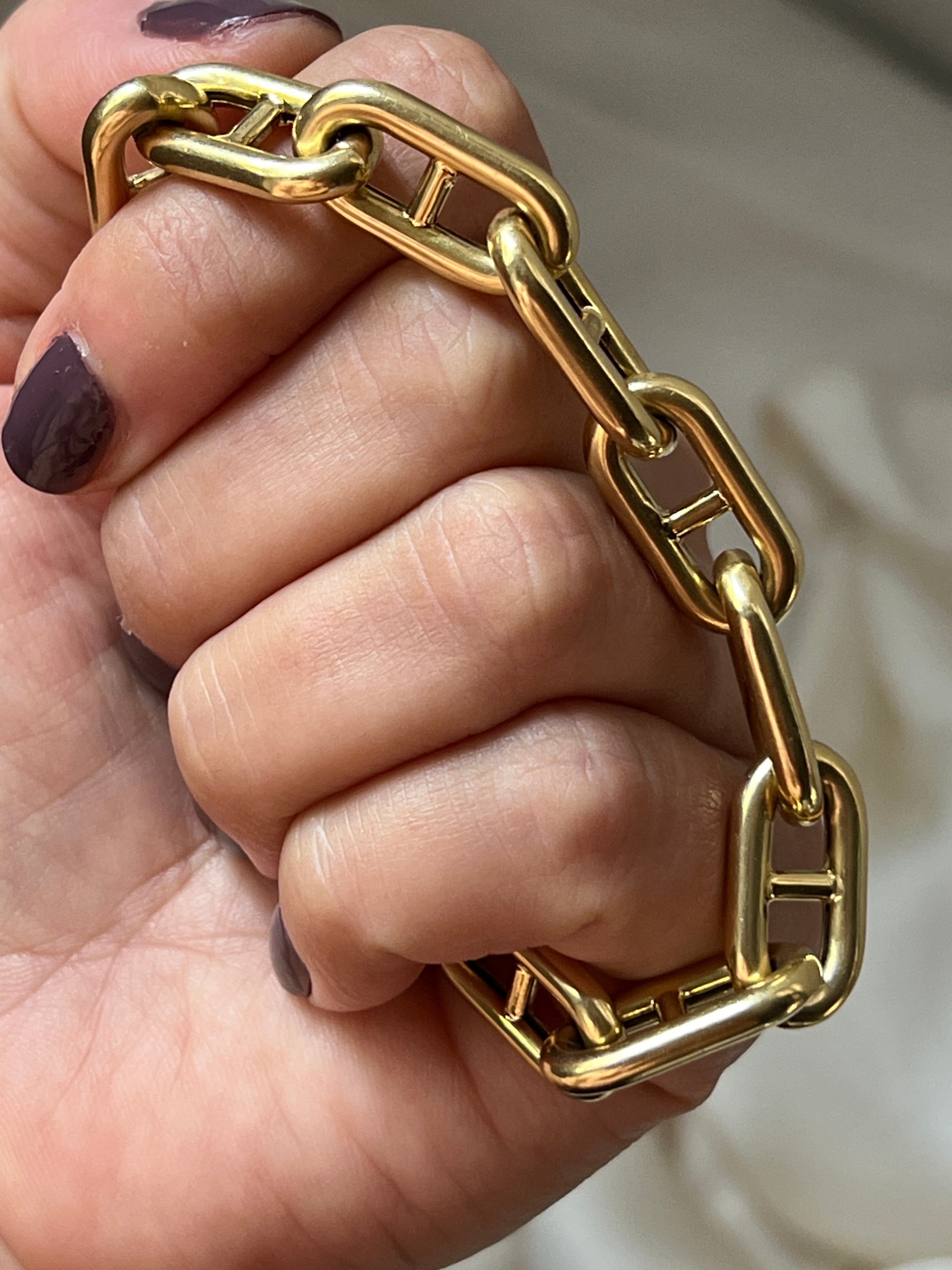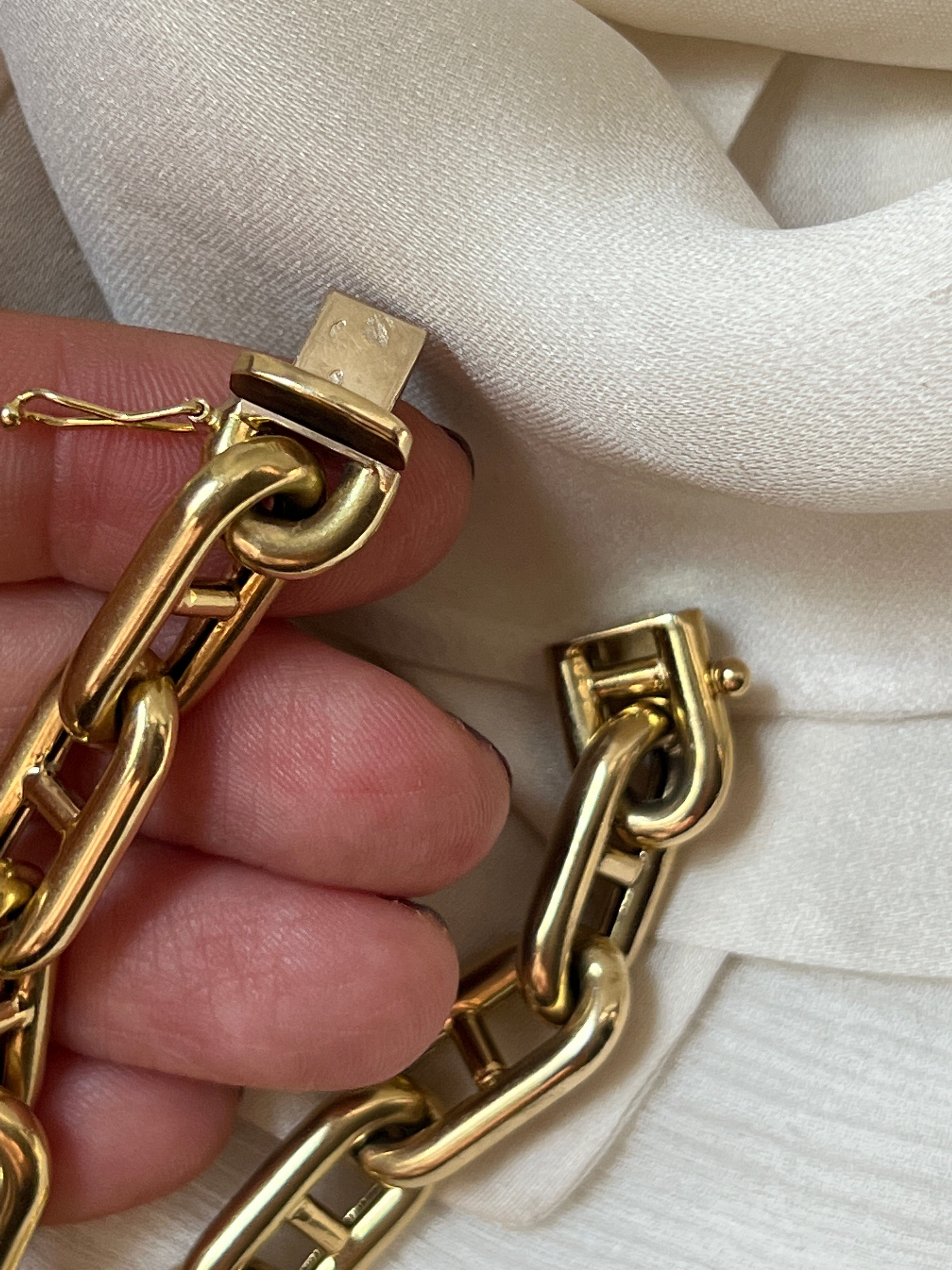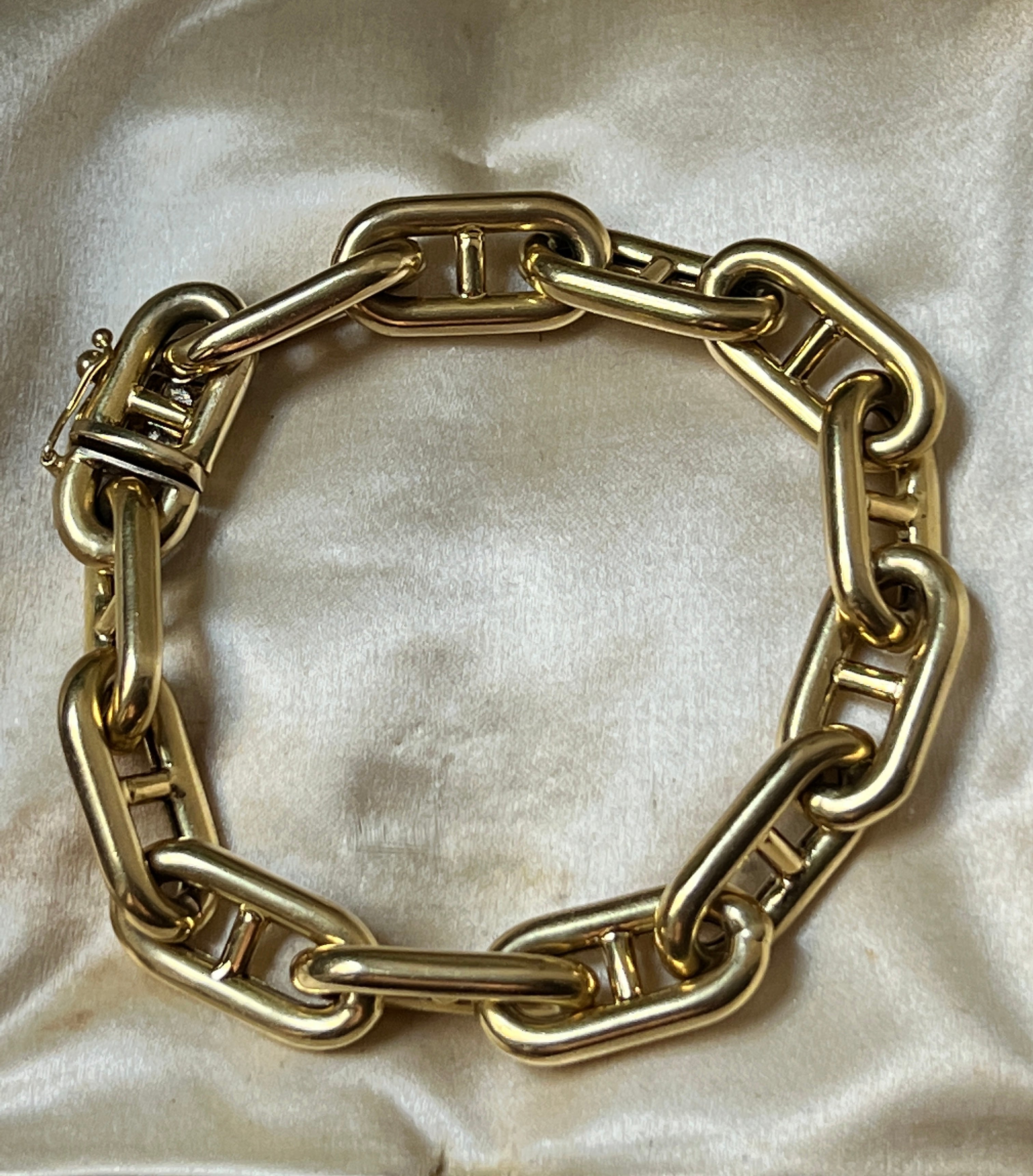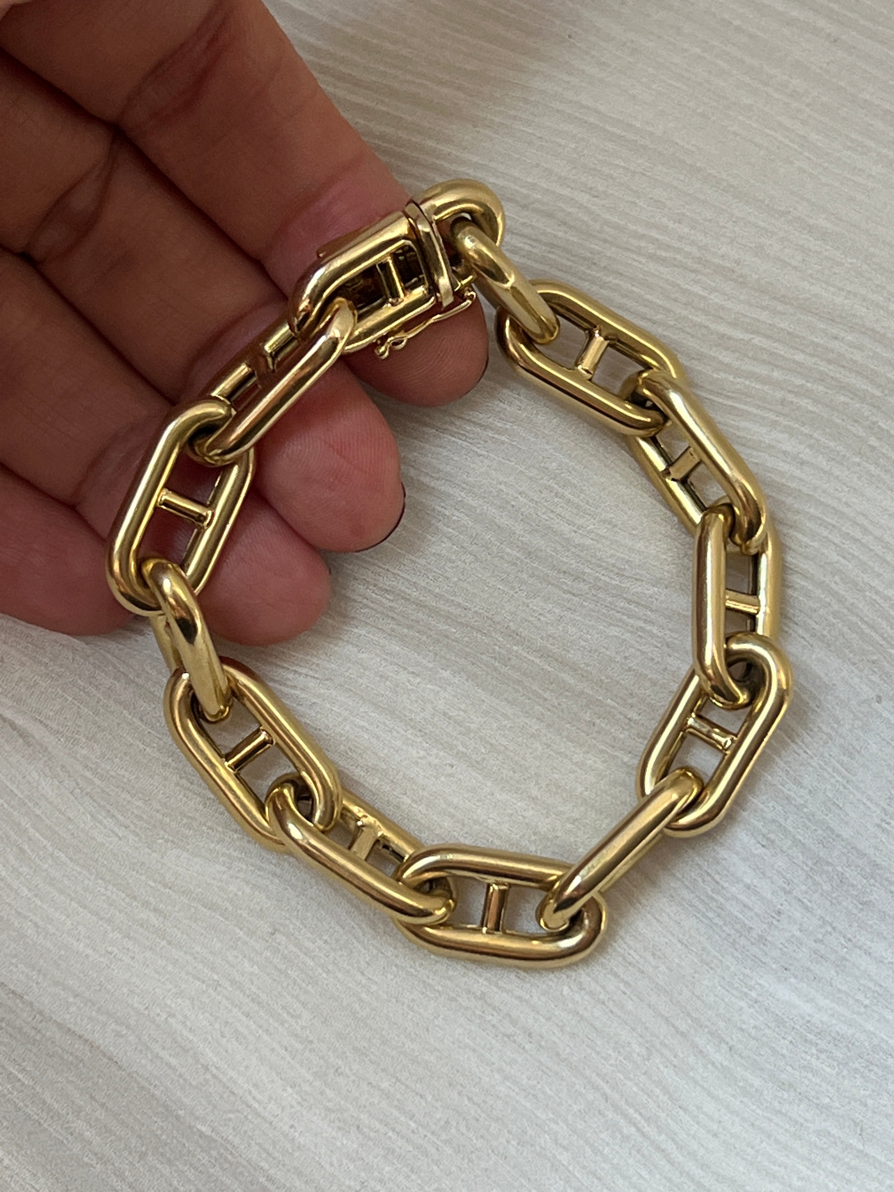 Vintage French 18k gold mariner link bracelet. This bracelet is made in 18k buttery gold with chunky mariner link (10mm width). It has a hinged closure with a safety on one side. It measures 7.6 inches. It is hallmarked with a french eagle head hallmark and the makers initials GLLC. It was made in the 70s in France.