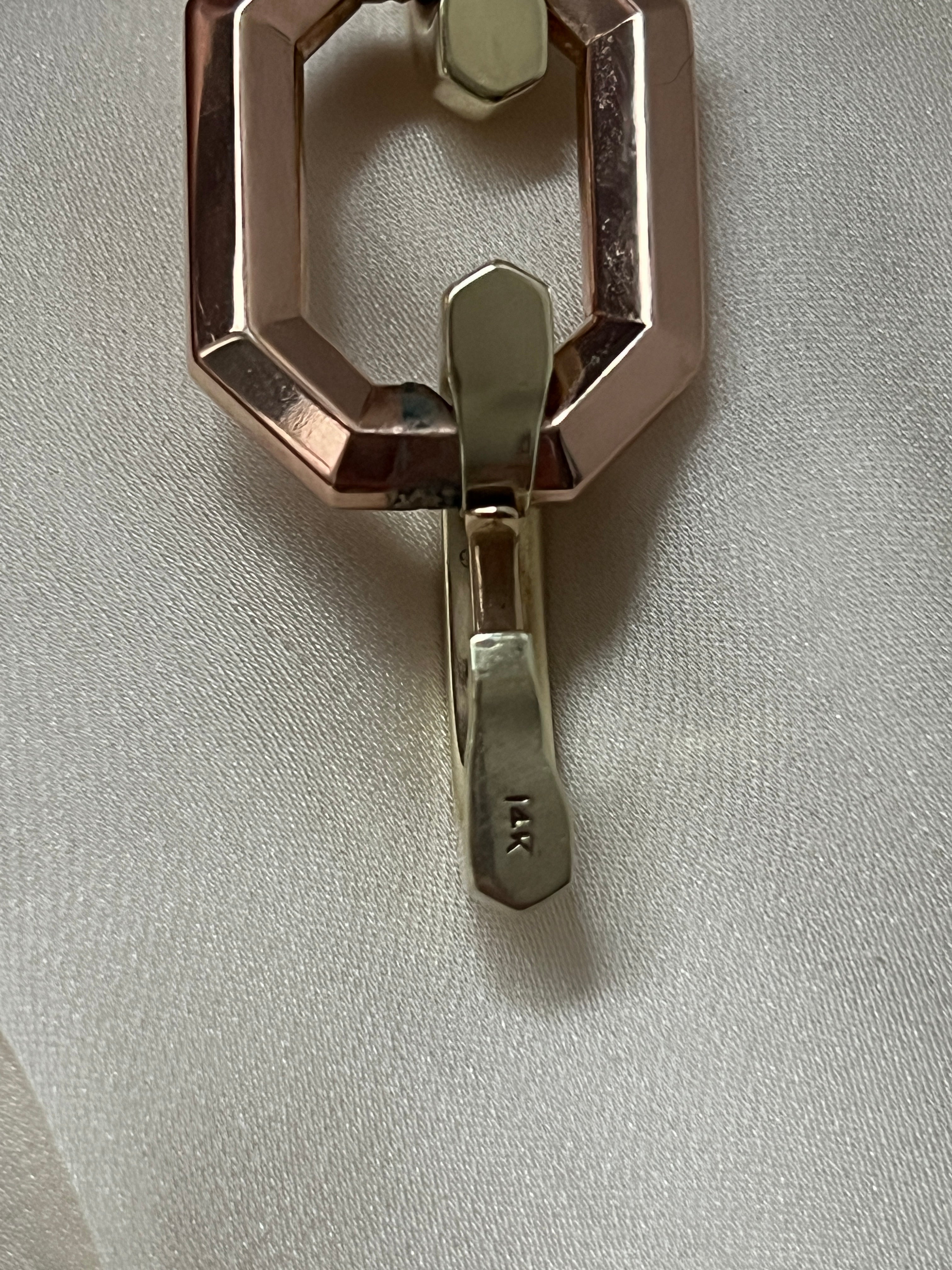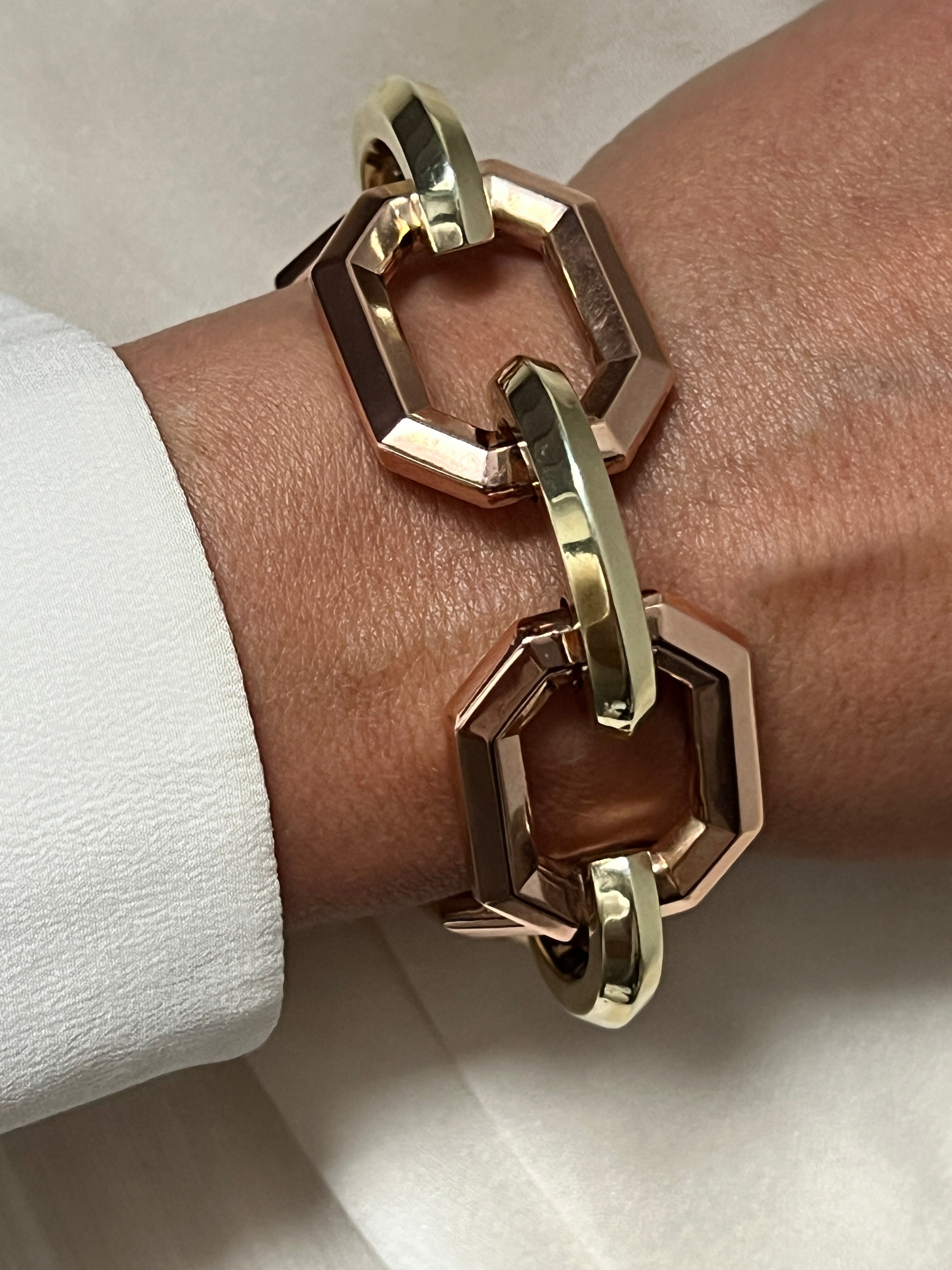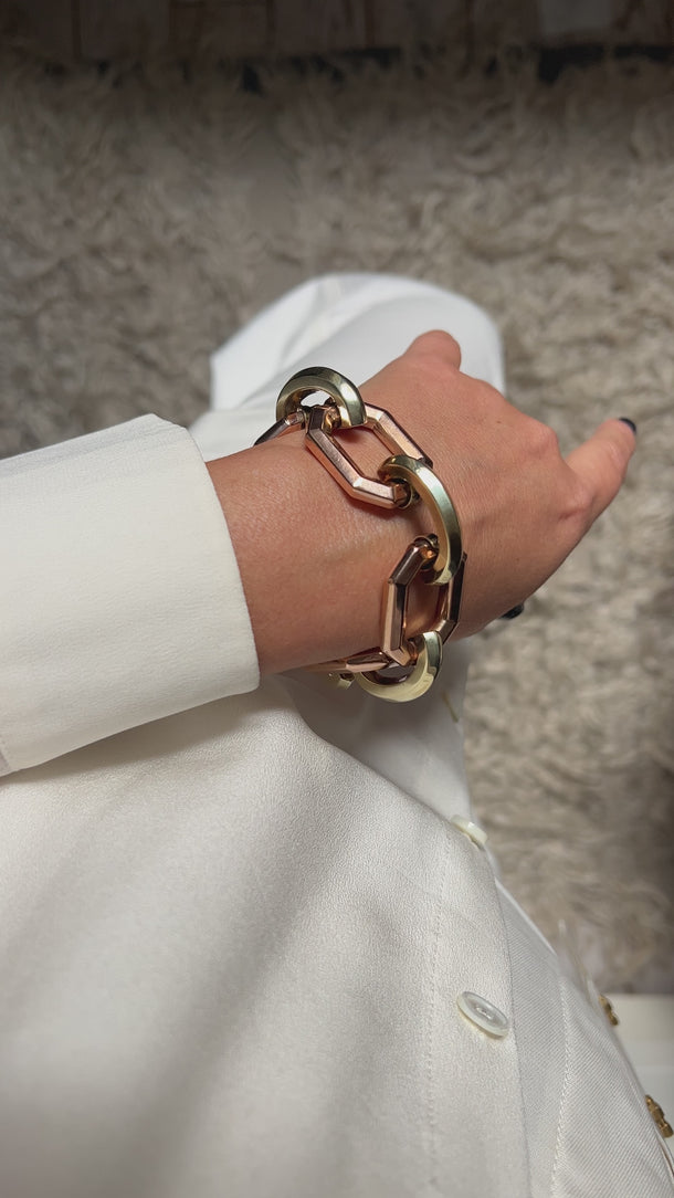 Beautiful Art Deco 14k gold two tone geometric link bracelet. This bracelet features the two-dimensional Art Deco design with overlapping big link, made in two tone of pink and yellow gold. It is hallmarked 14k. The link width is 25mm.