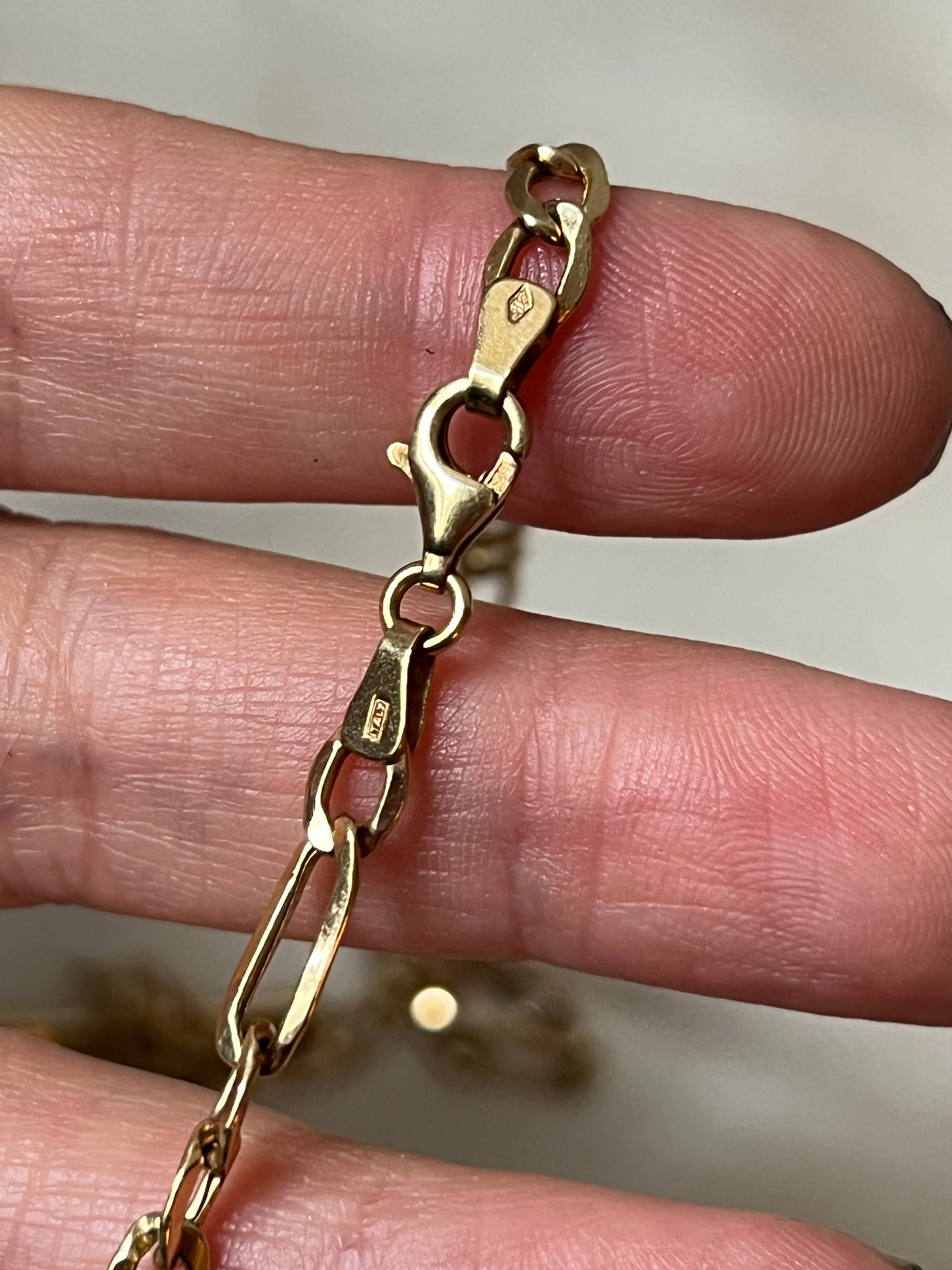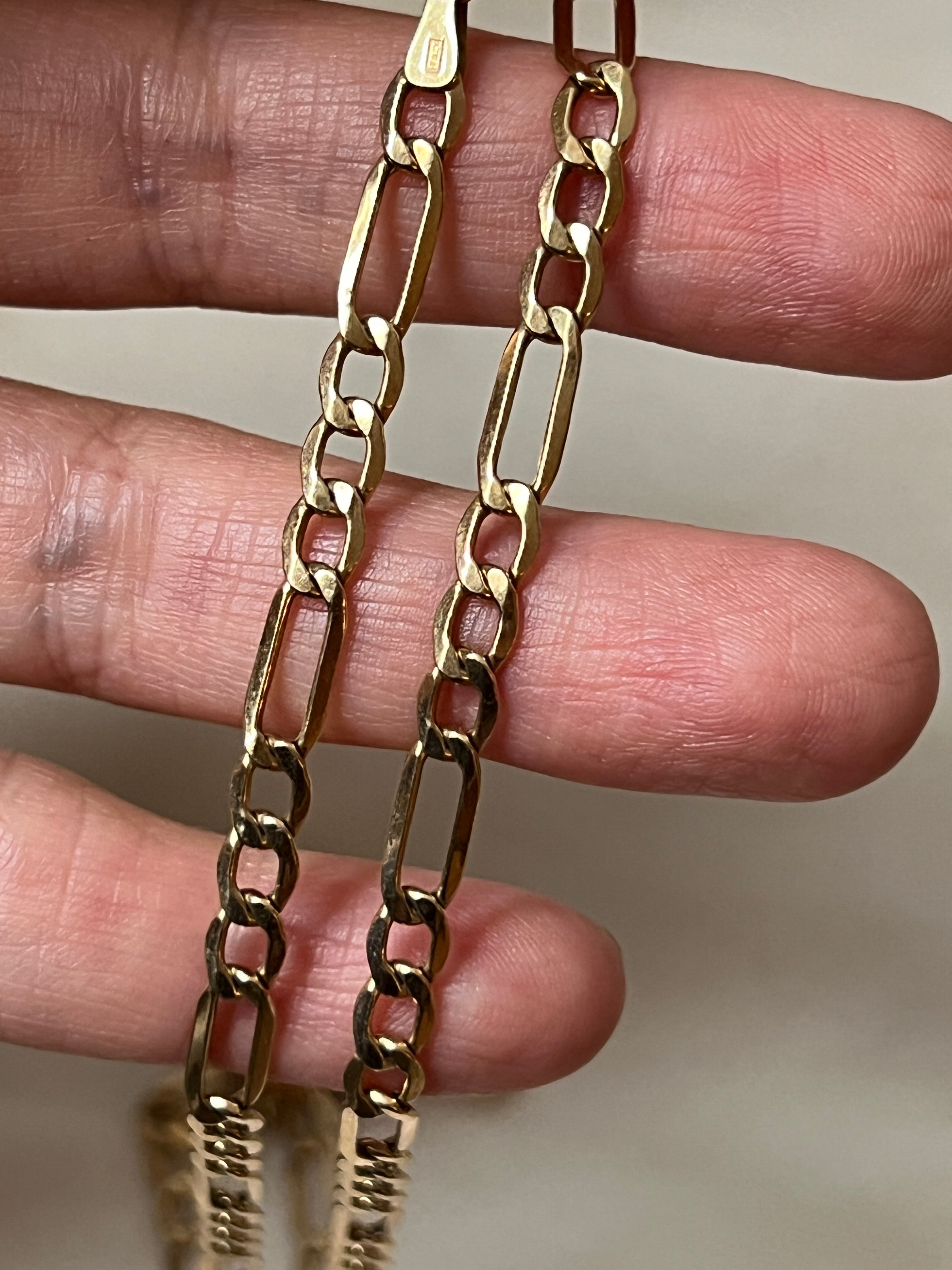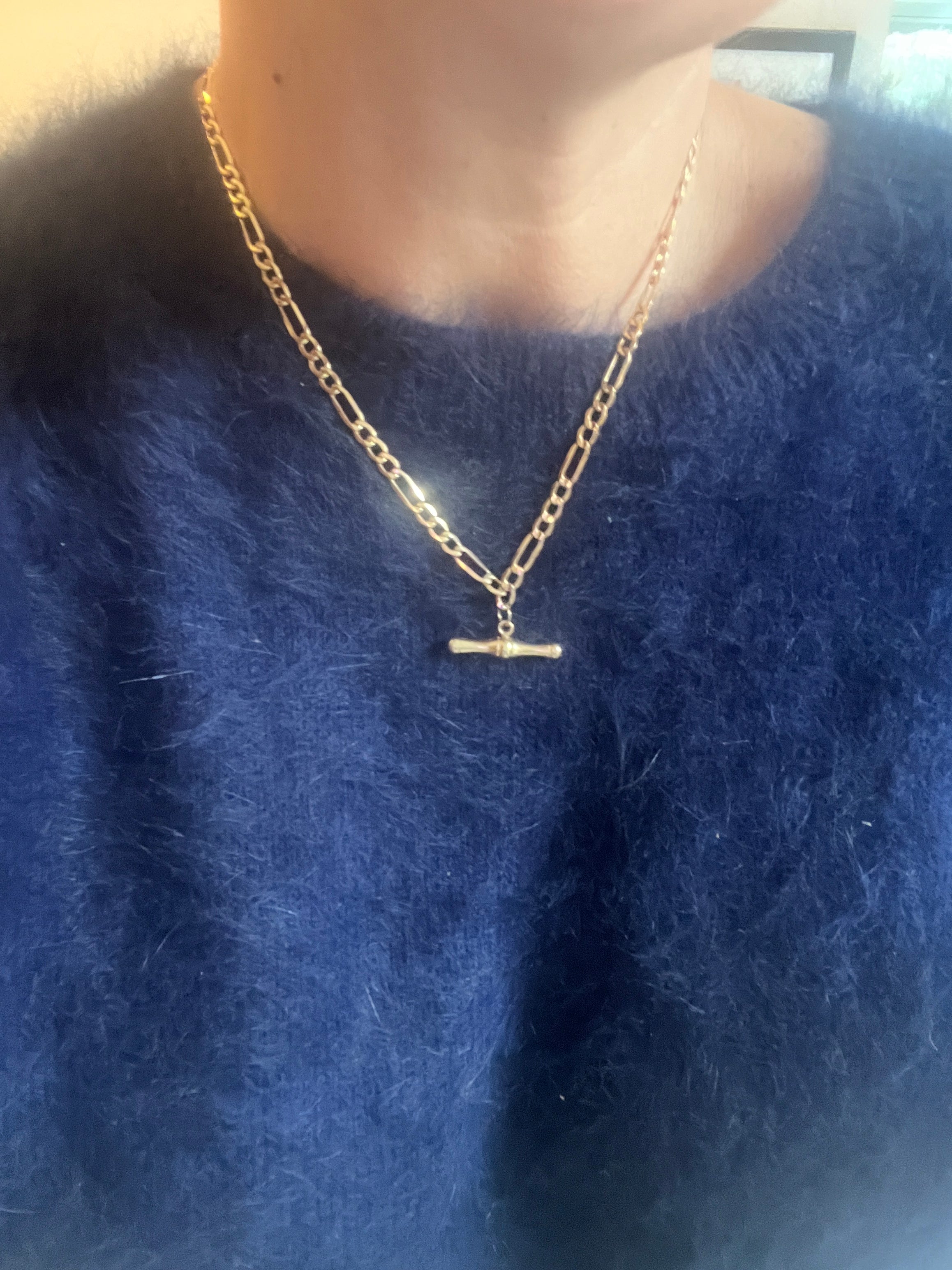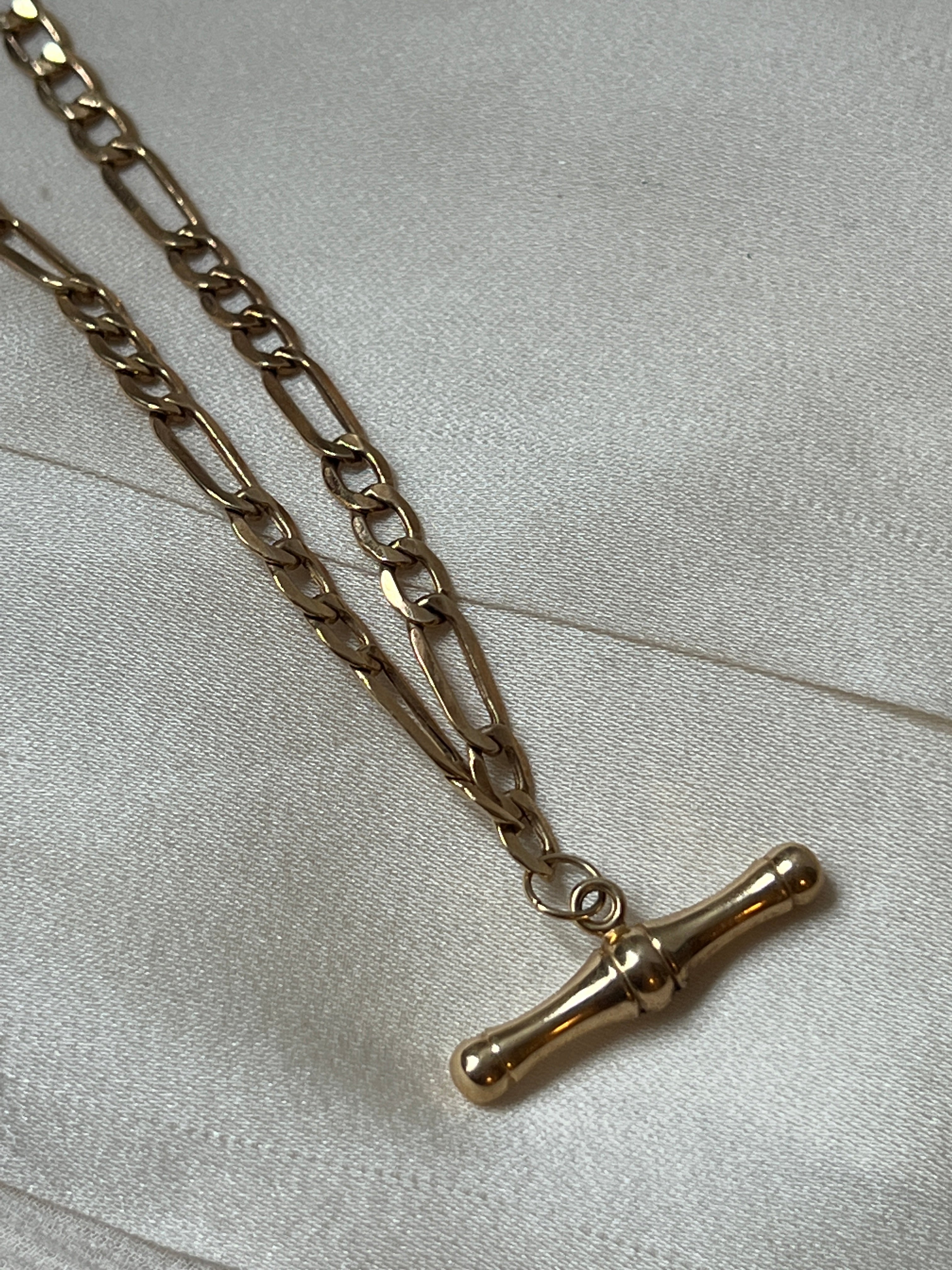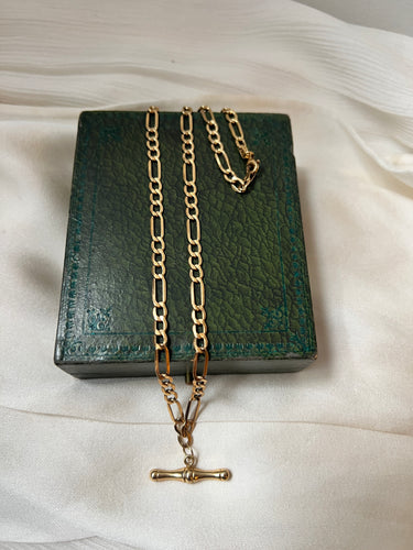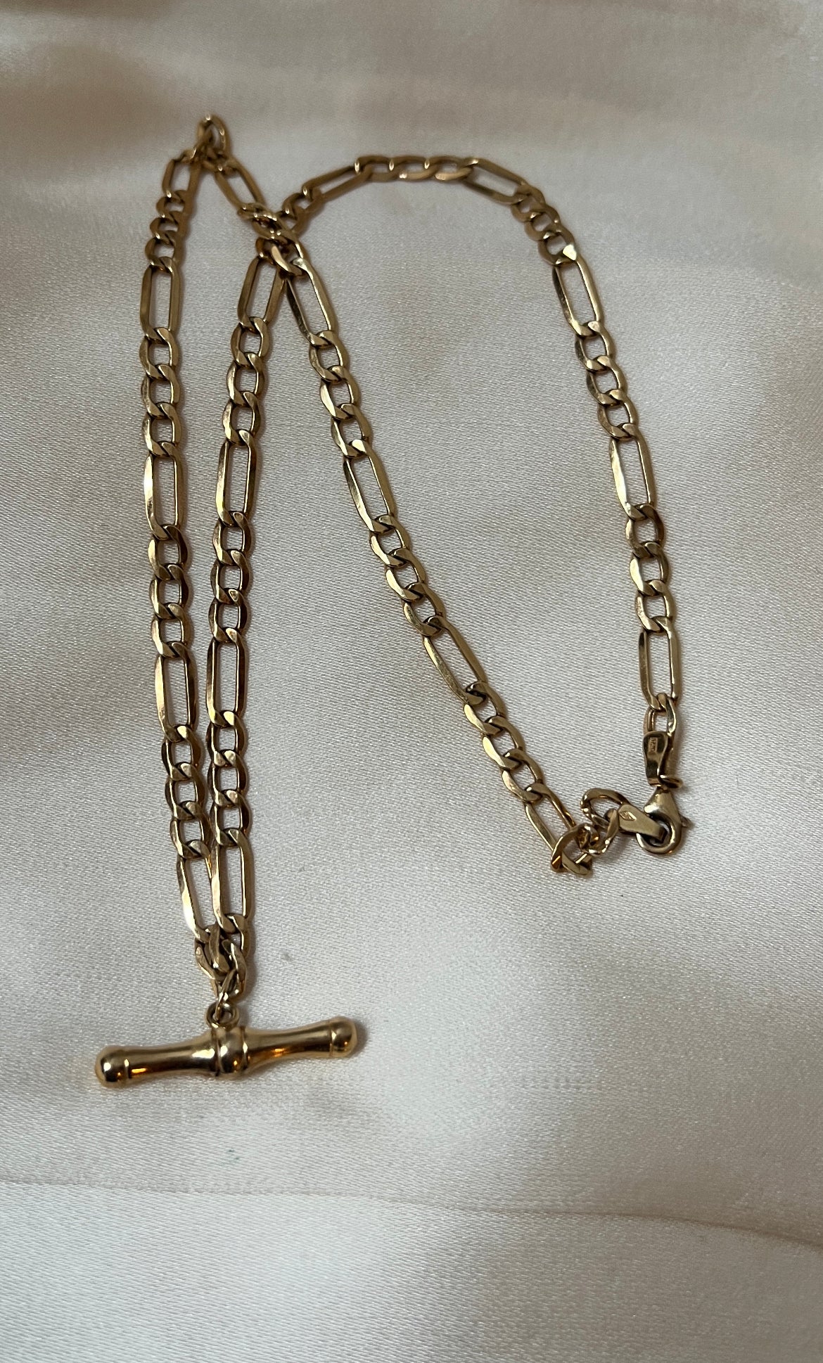 Vintage 10k gold watch chain with open flat links and T bar. The chain is light weight, has open cuban links and a t bar. It is hallmarked Italy with the metal content 375.