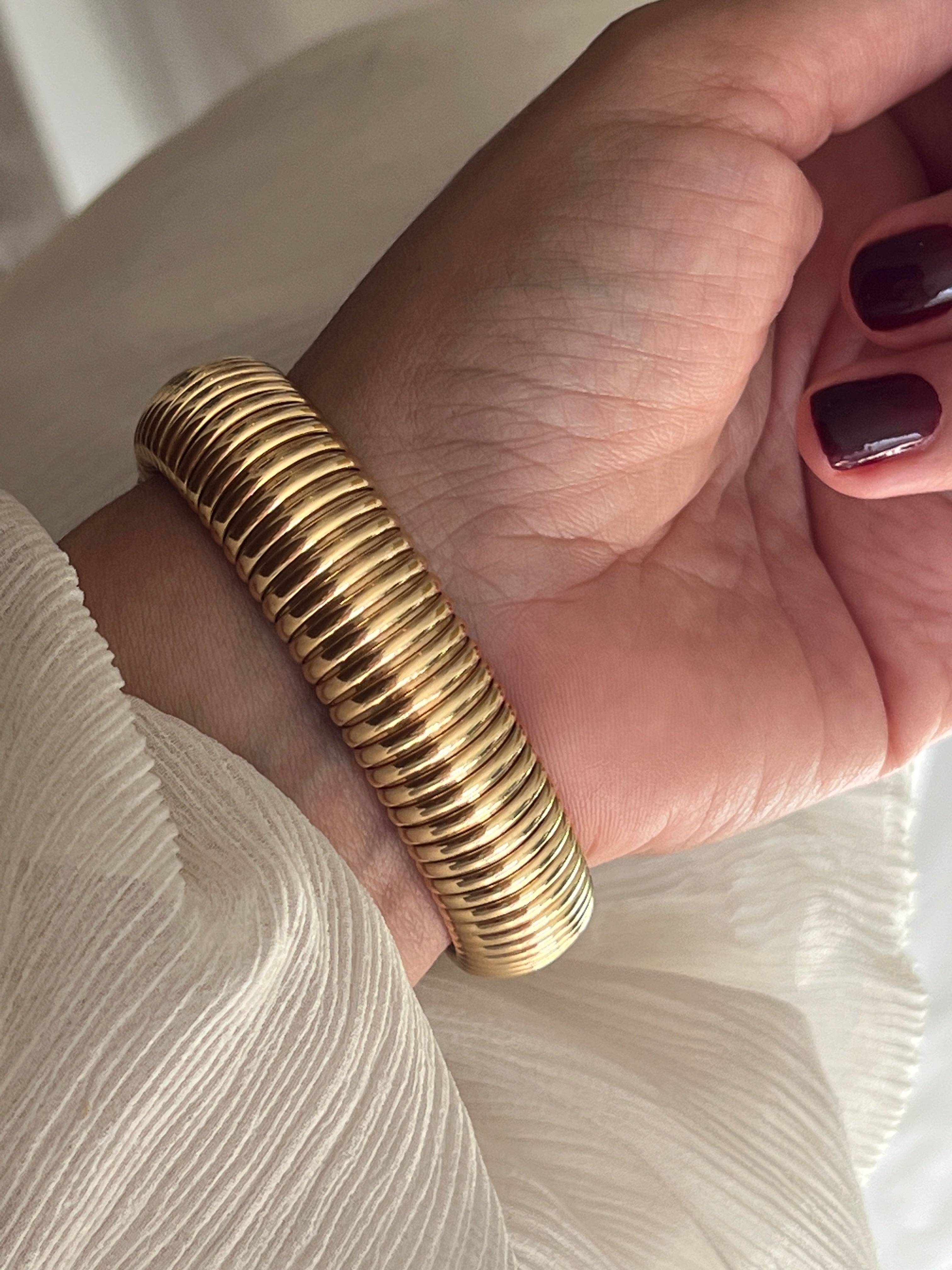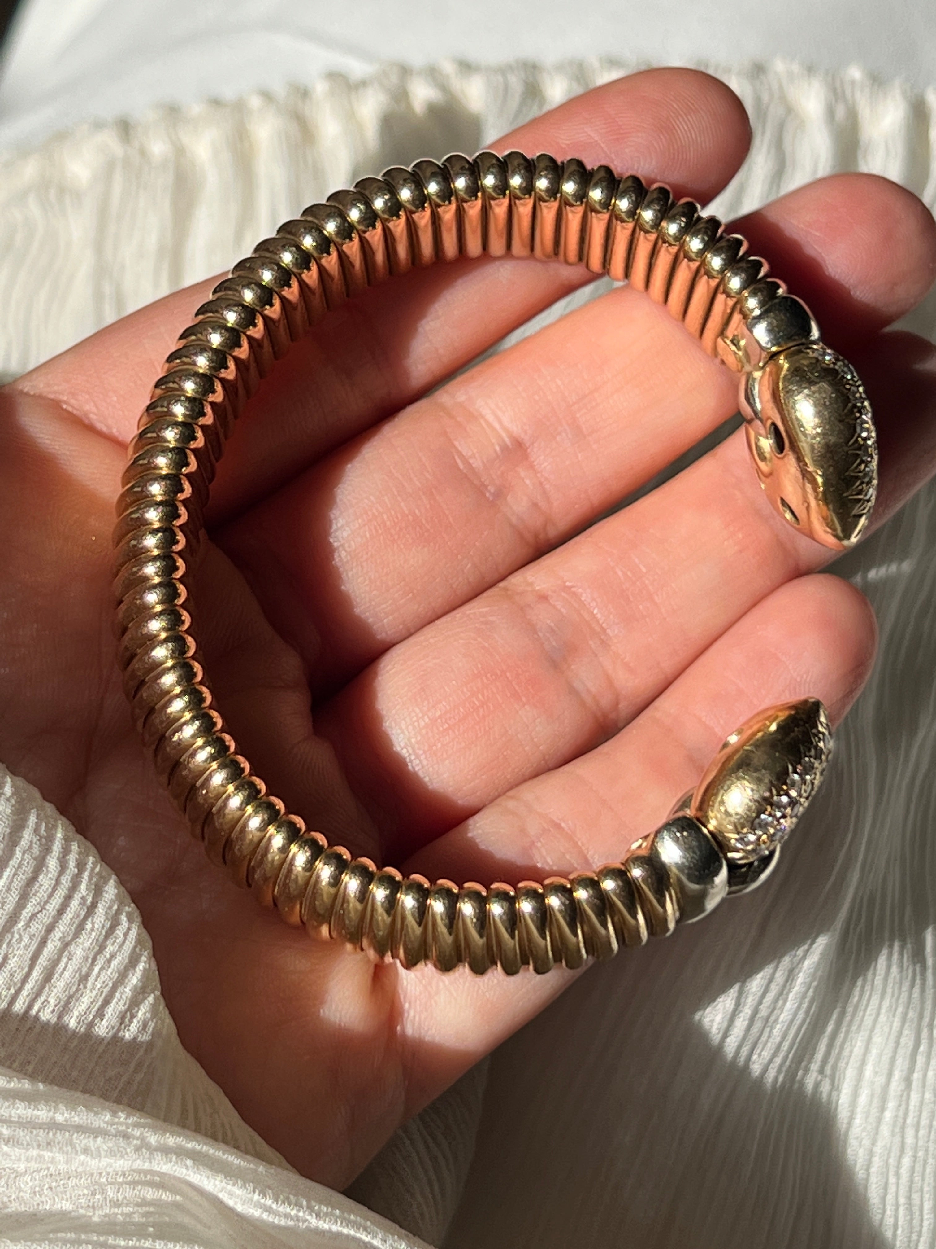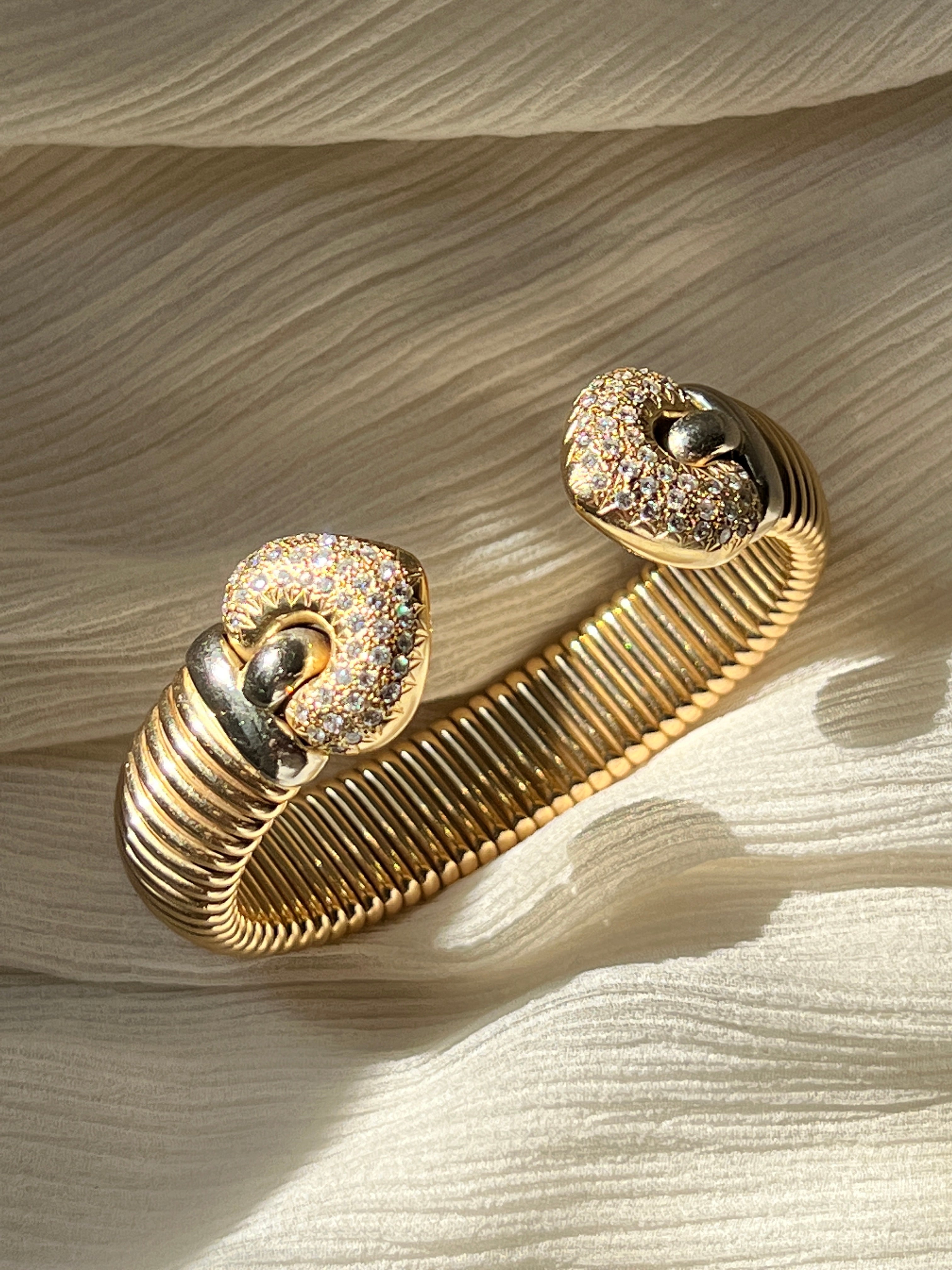 Vintage 14k gold tubogas bracelet with double heart diamonds