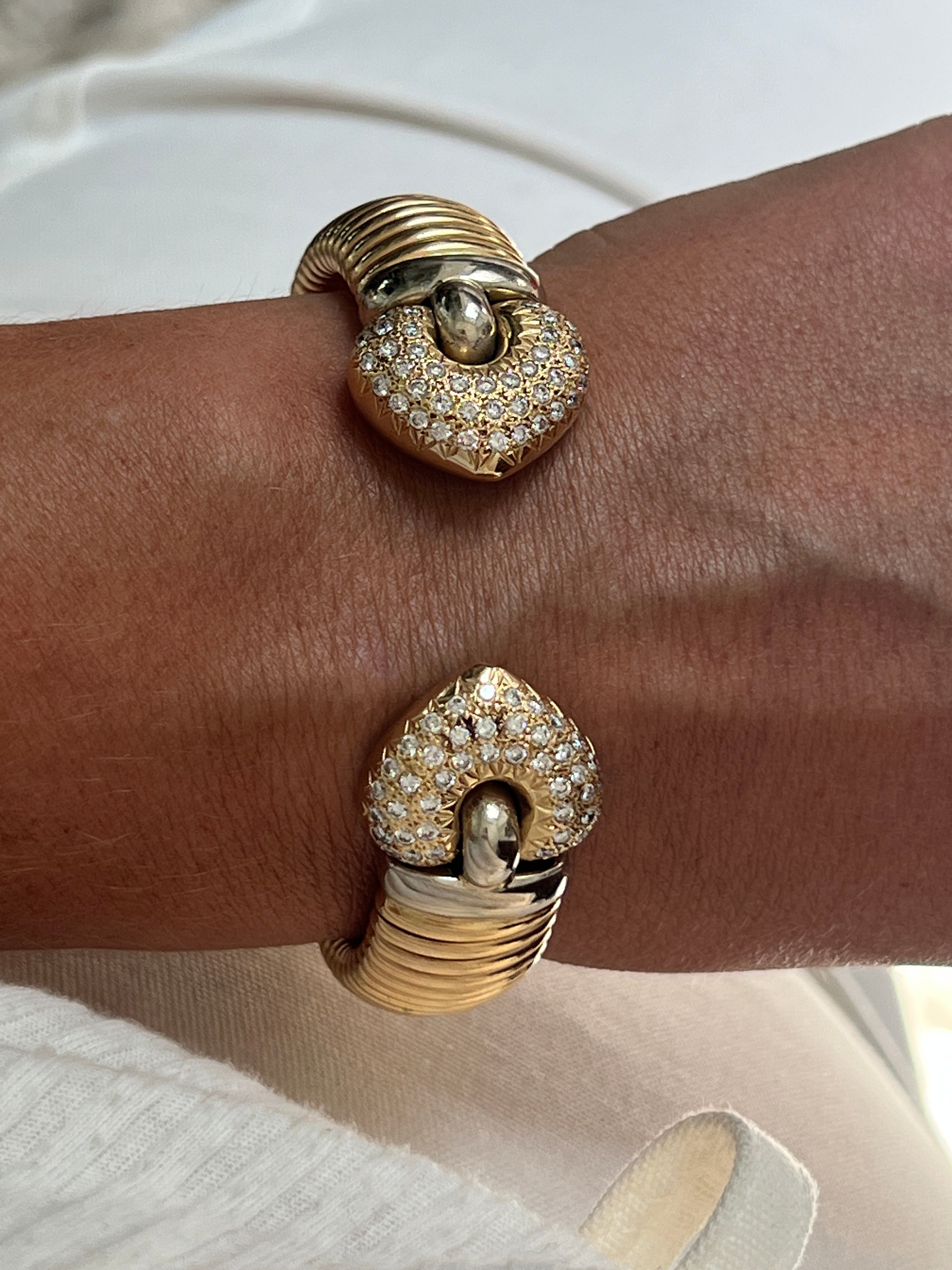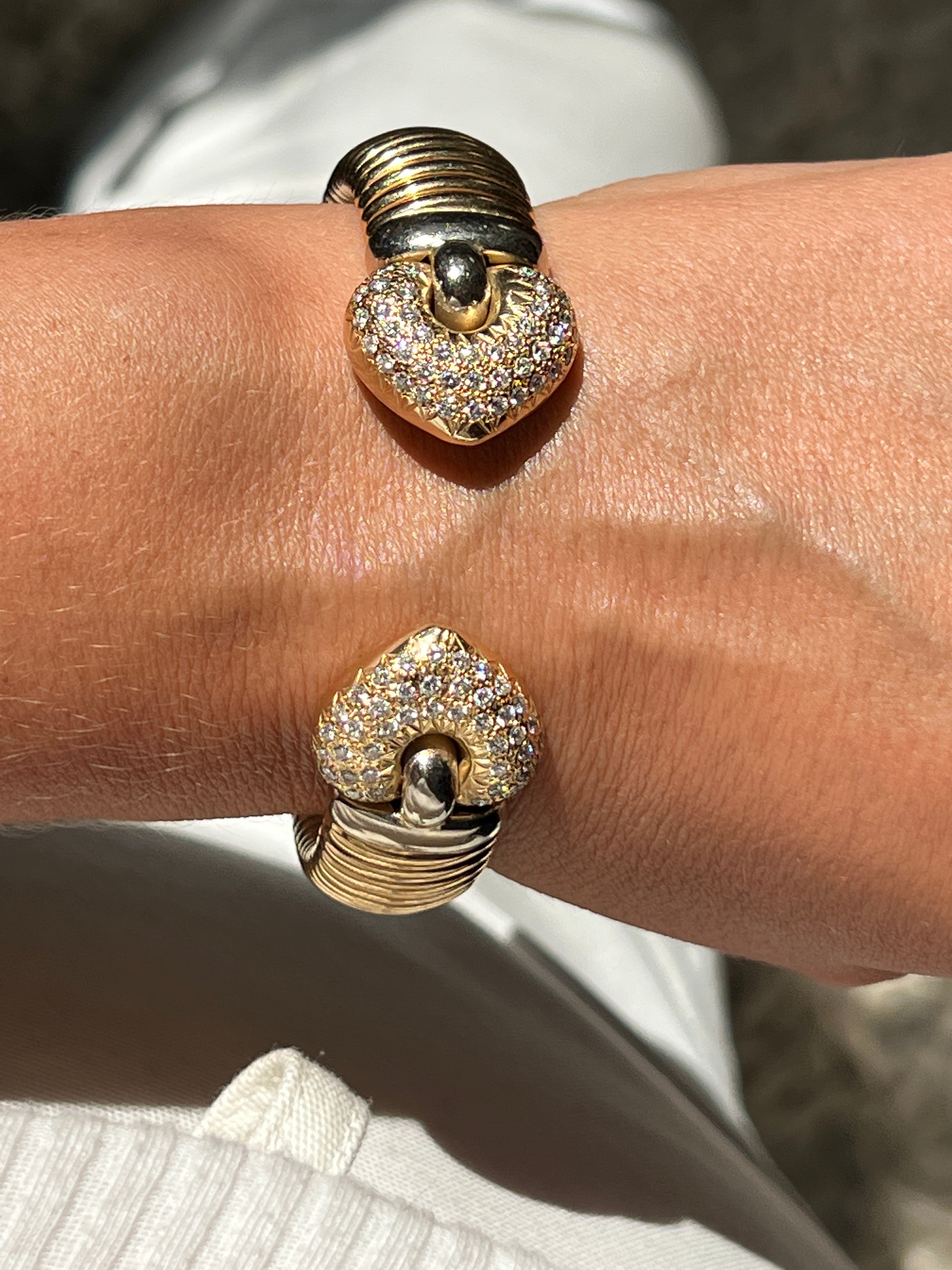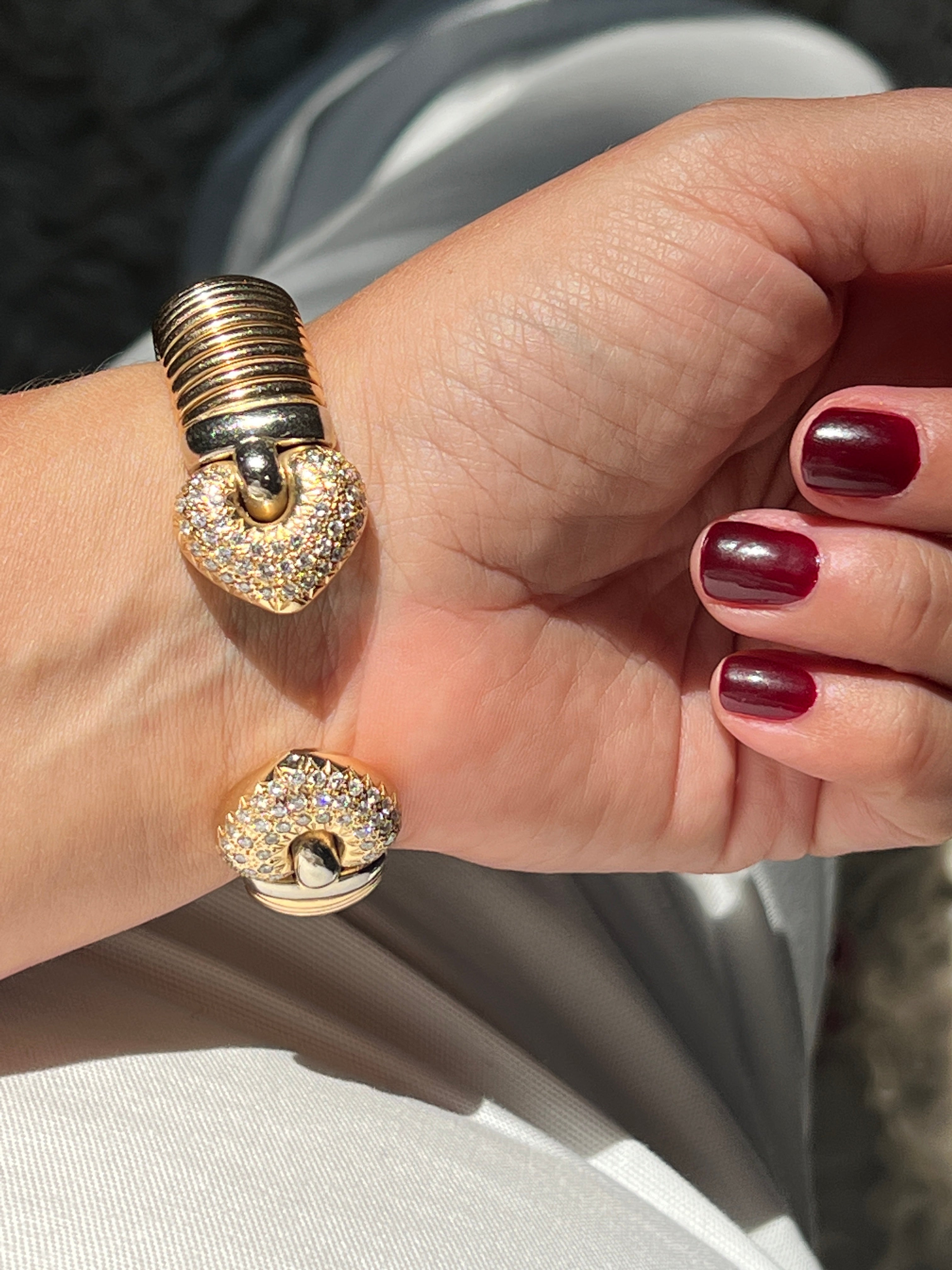 Gorgeous Vintage 14k gold tubogas bracelet with double heart diamonds. The bracelet has a tubogas design and features two hearts opening with natural sparkling diamonds for a total weight of 2 carat. It is hallmarked 14k.