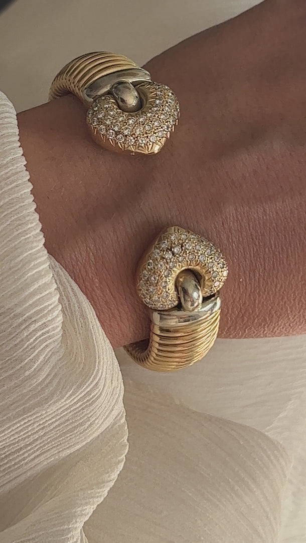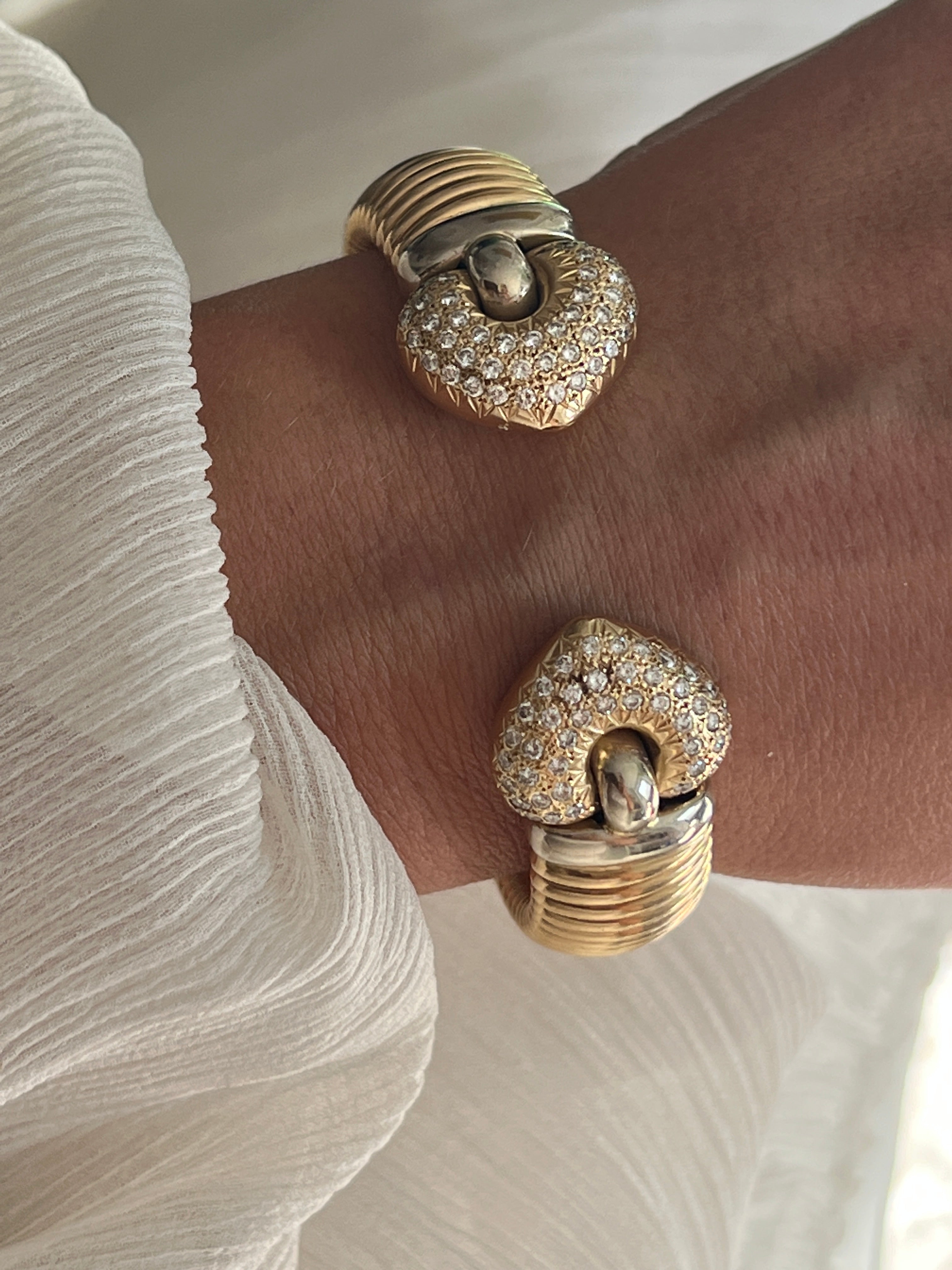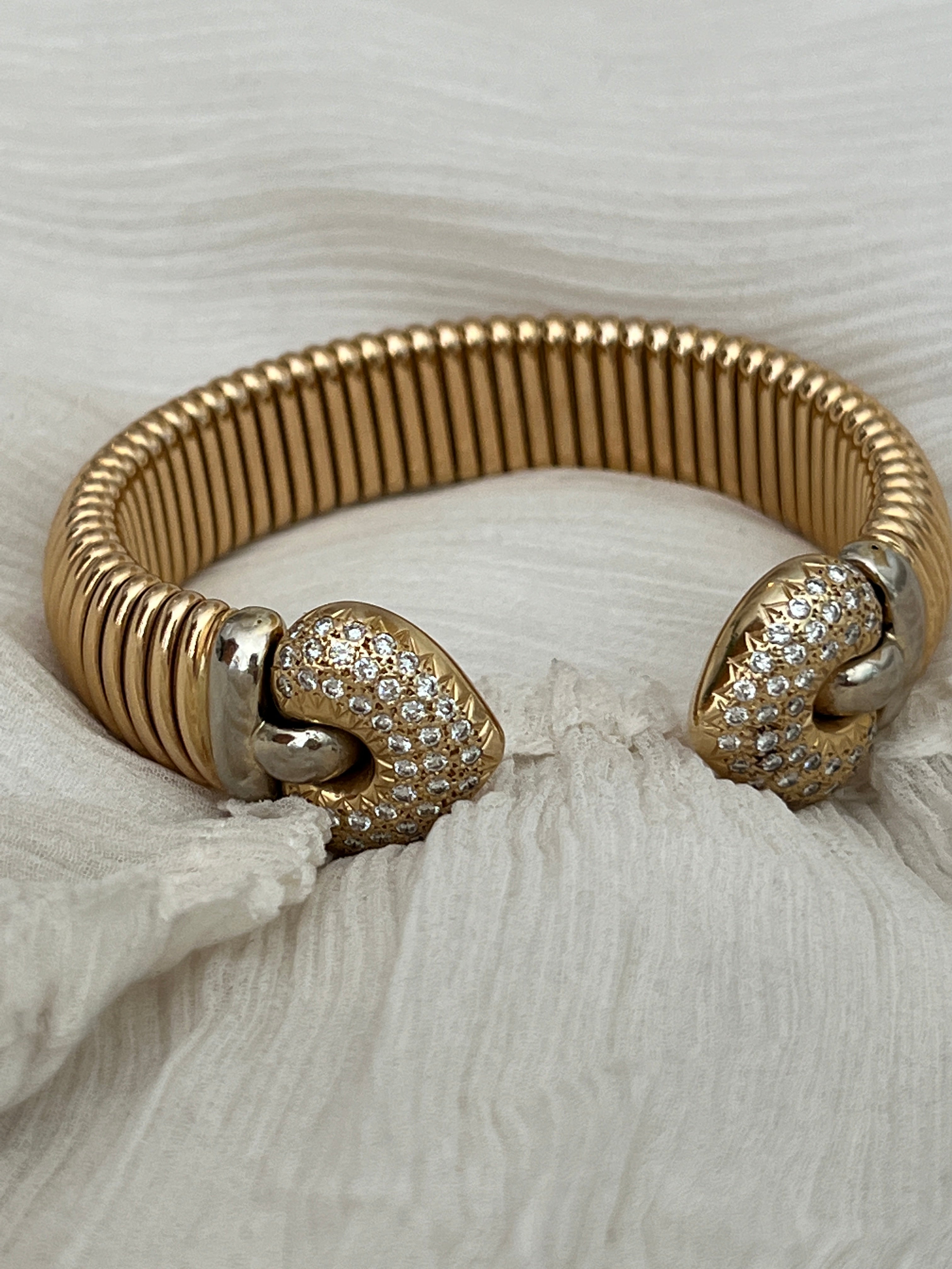 Gorgeous Vintage 14k gold tubogas bracelet with double heart diamonds. The bracelet has a tubogas design and features two hearts opening with natural sparkling diamonds for a total weight of 2 carat. It is hallmarked 14k.