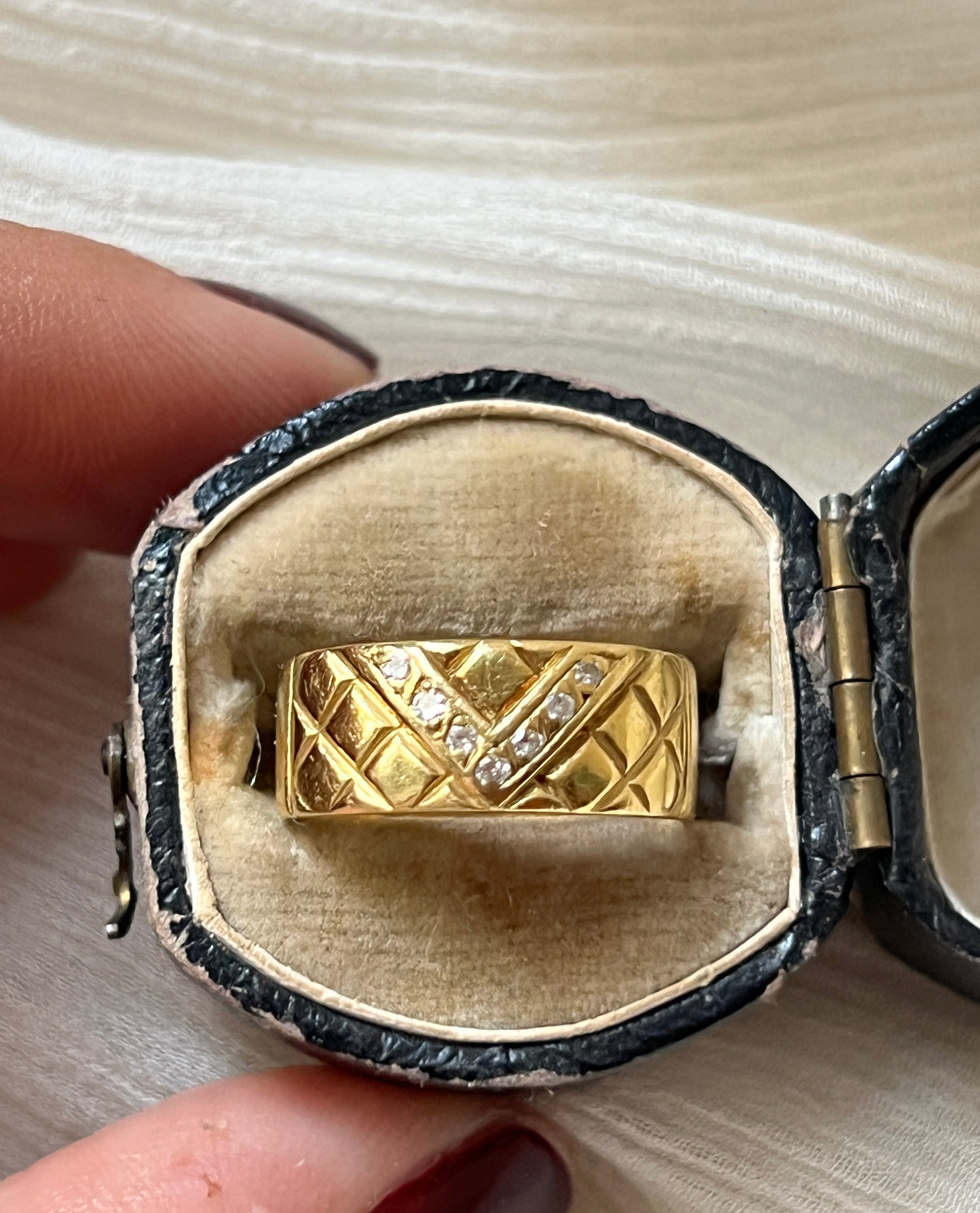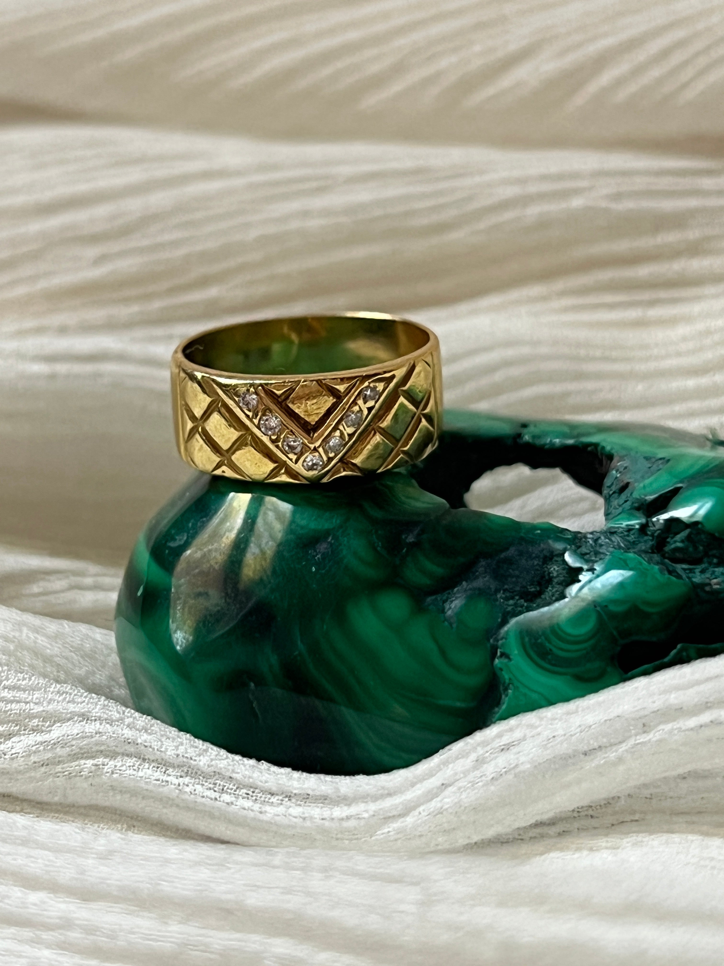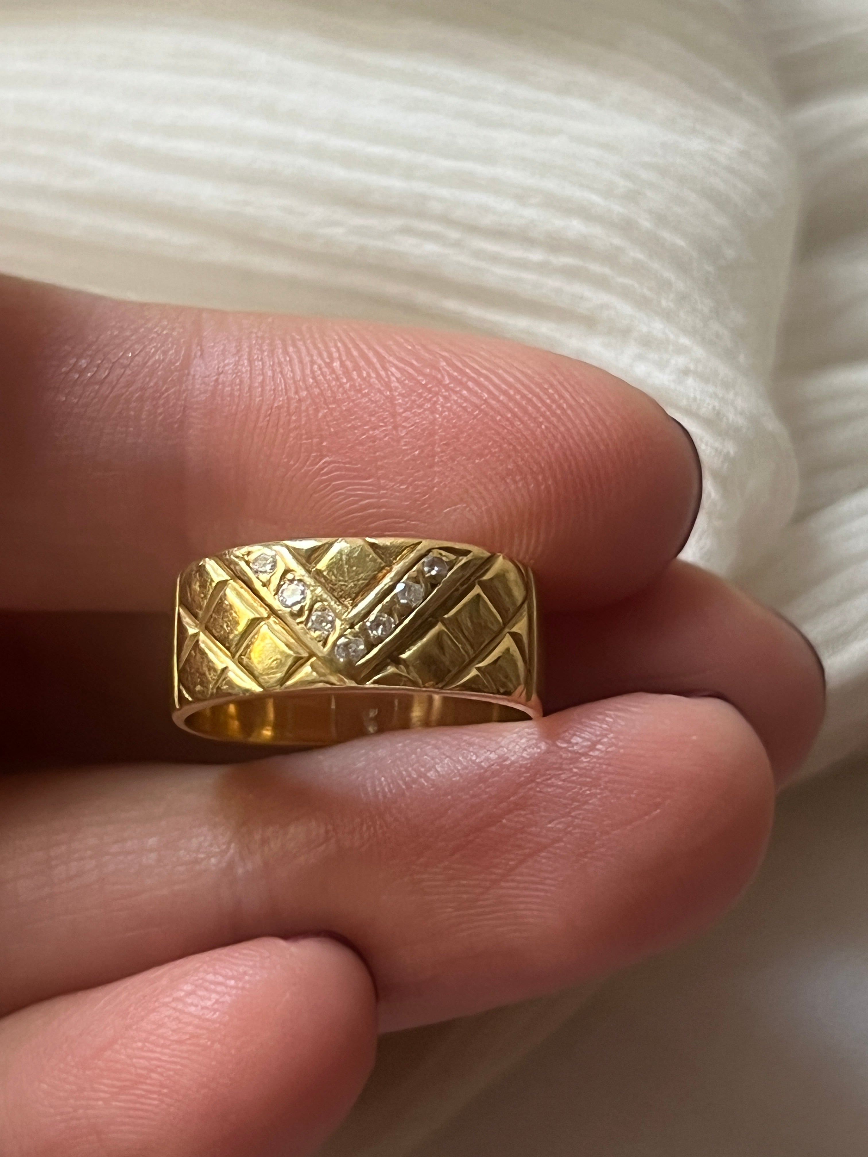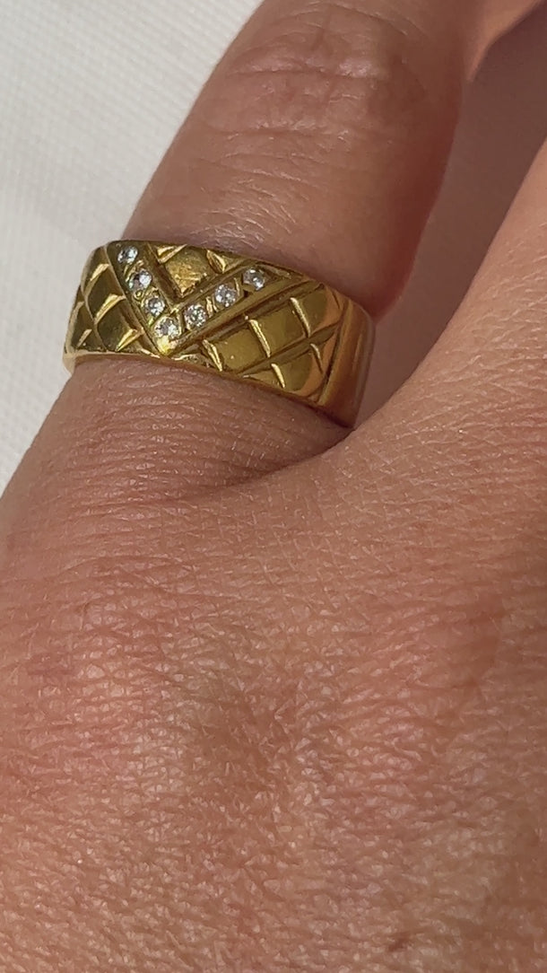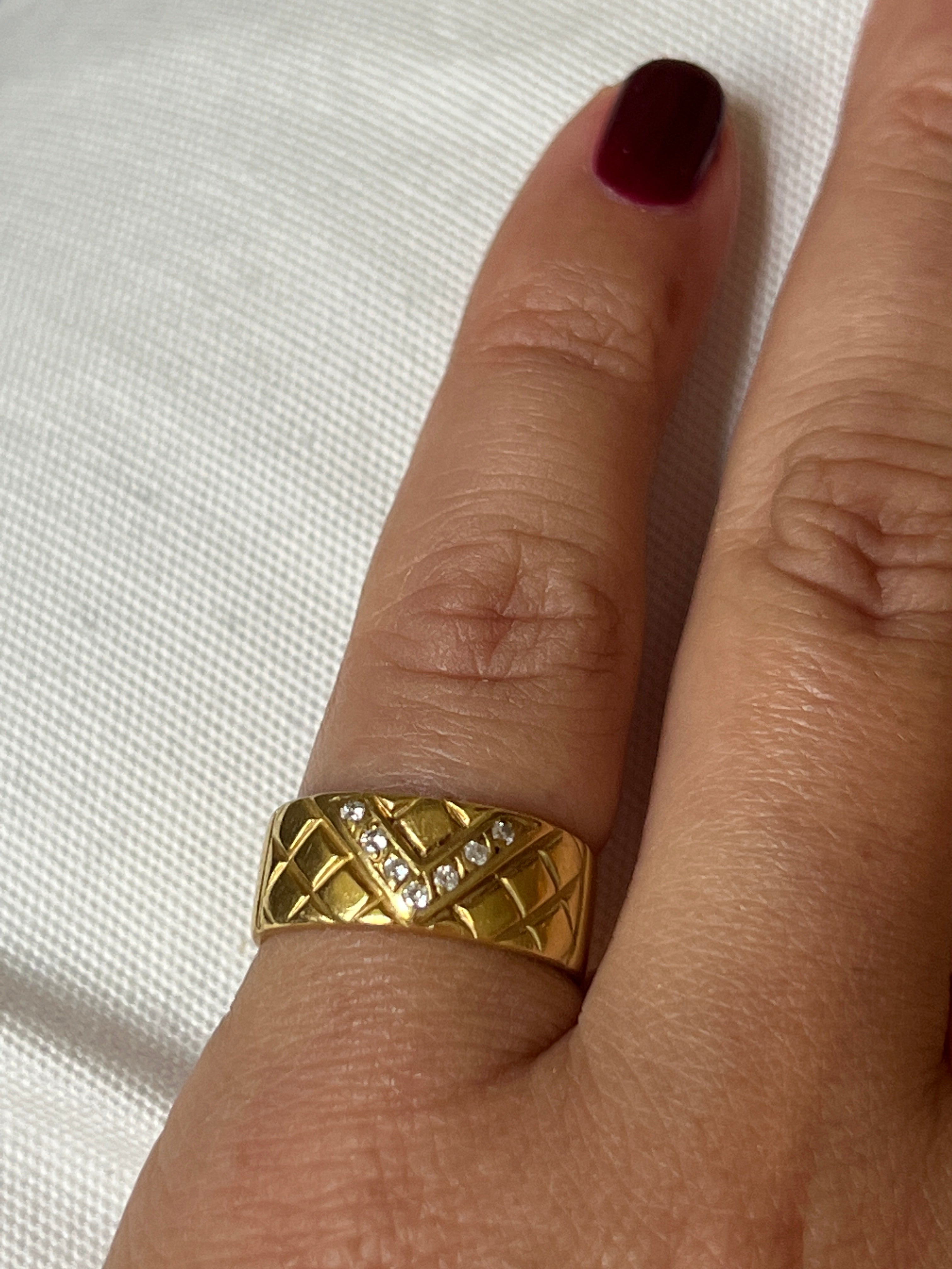 This is a lovely Vintage French 18k gold diamonds ring with the initial V. It has a beautiful texture design and seven natural diamonds. It is hallmarked with an eagle head on the back.