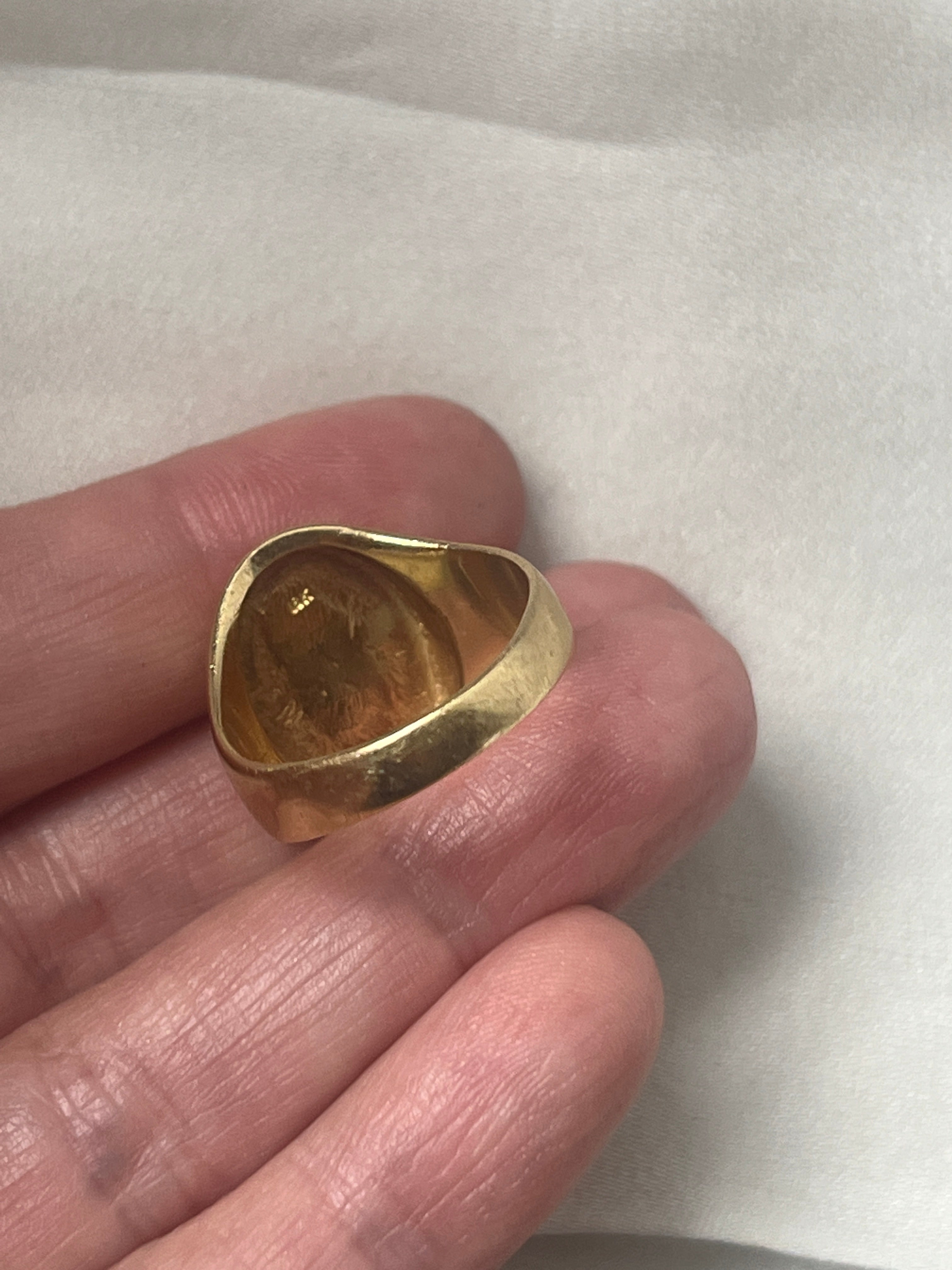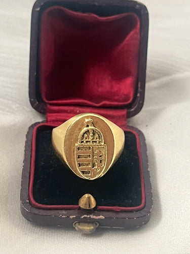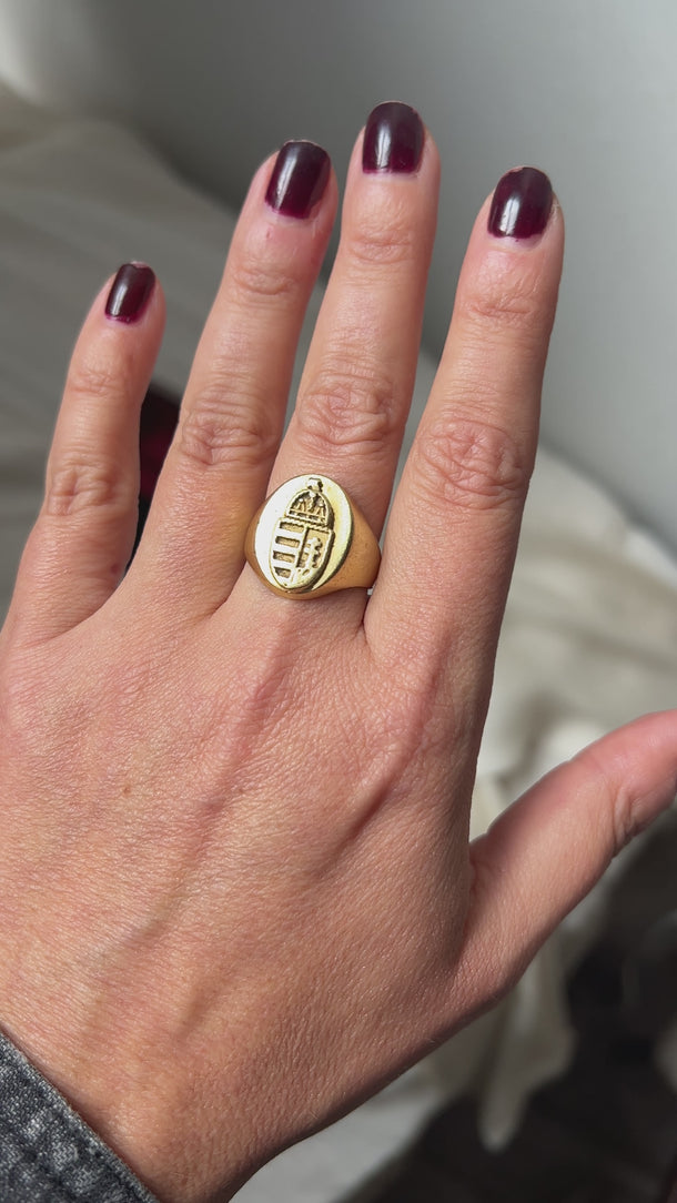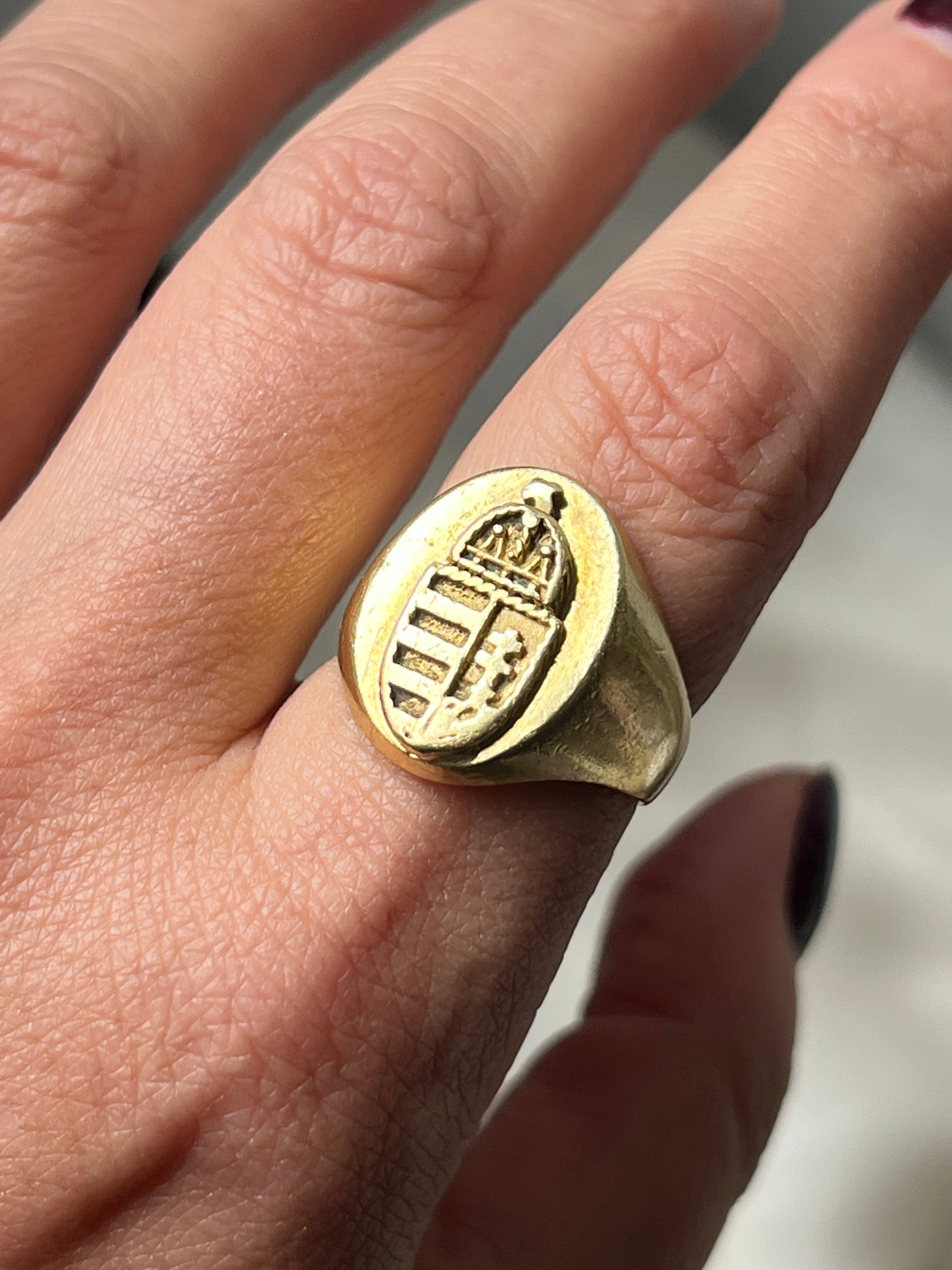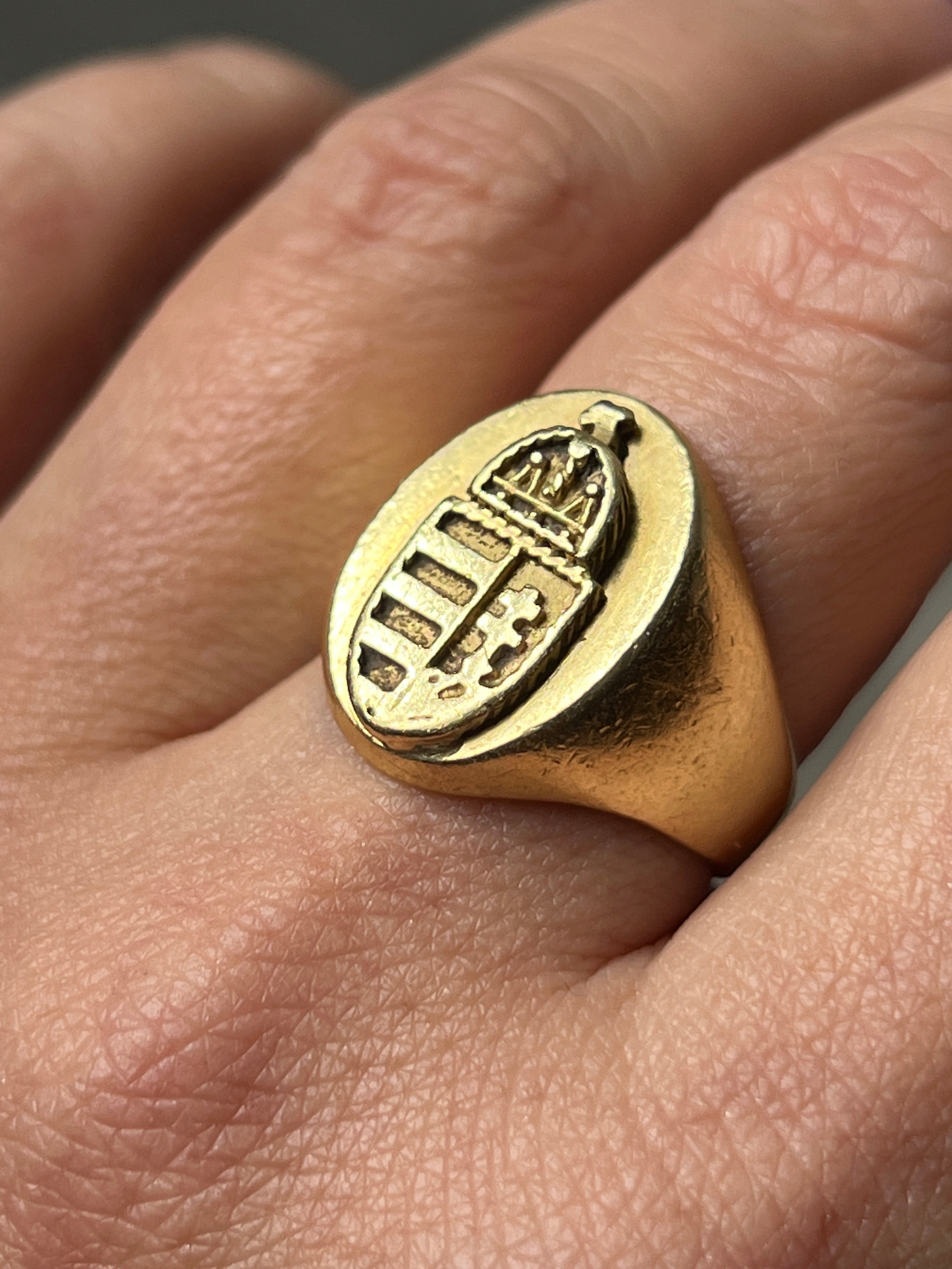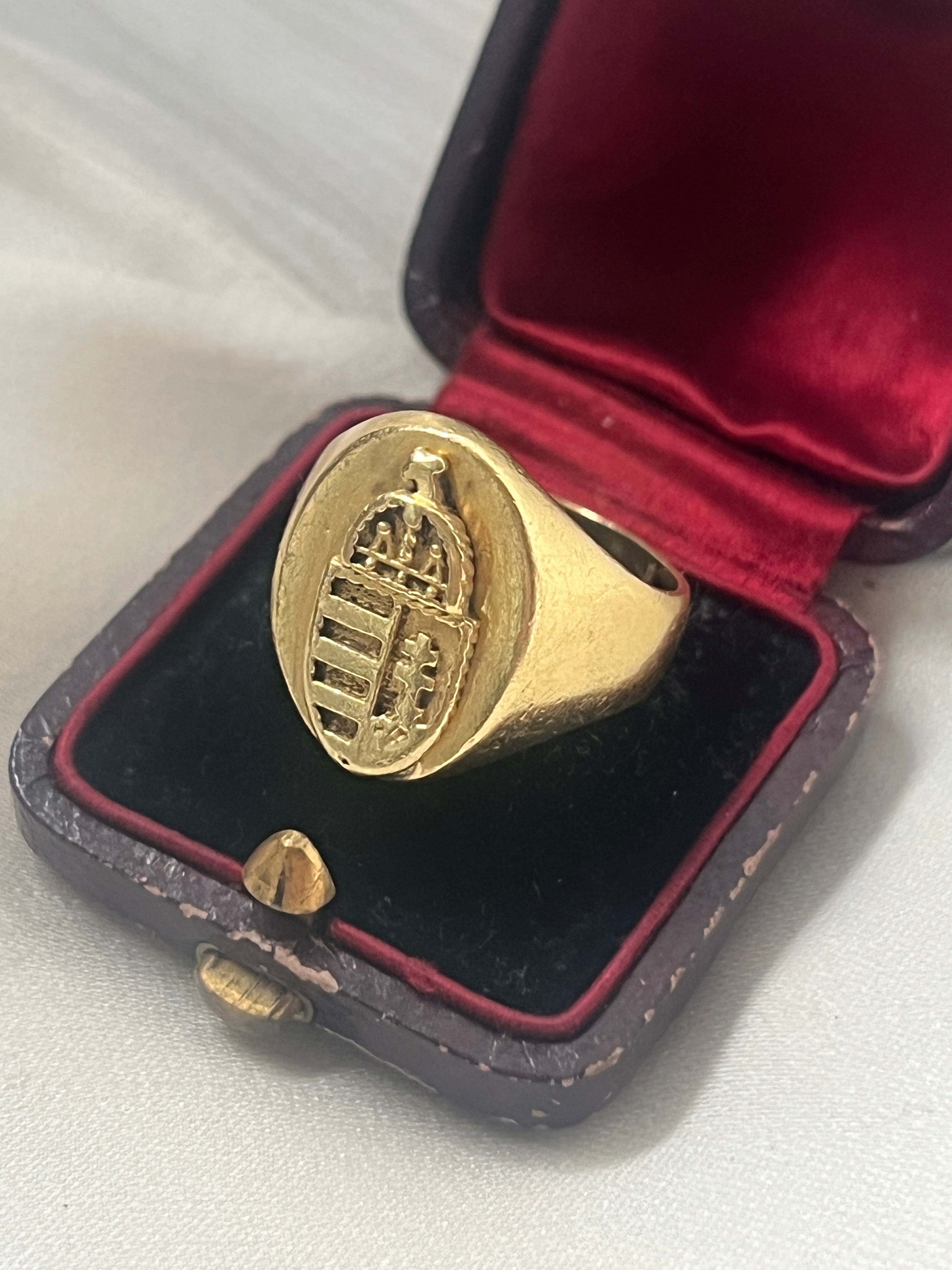 This is a hefty 18k gold signet ring featuring the Hungarian Coat of Arms crest. The coat of arms includes a vertically divided shield with bar on the left, a base of hill, a crown, and a patriarchal cross on the right, all topped with the Holy Crown. The ring is hallmarked 18k. The face measures 18 by 12mm.
