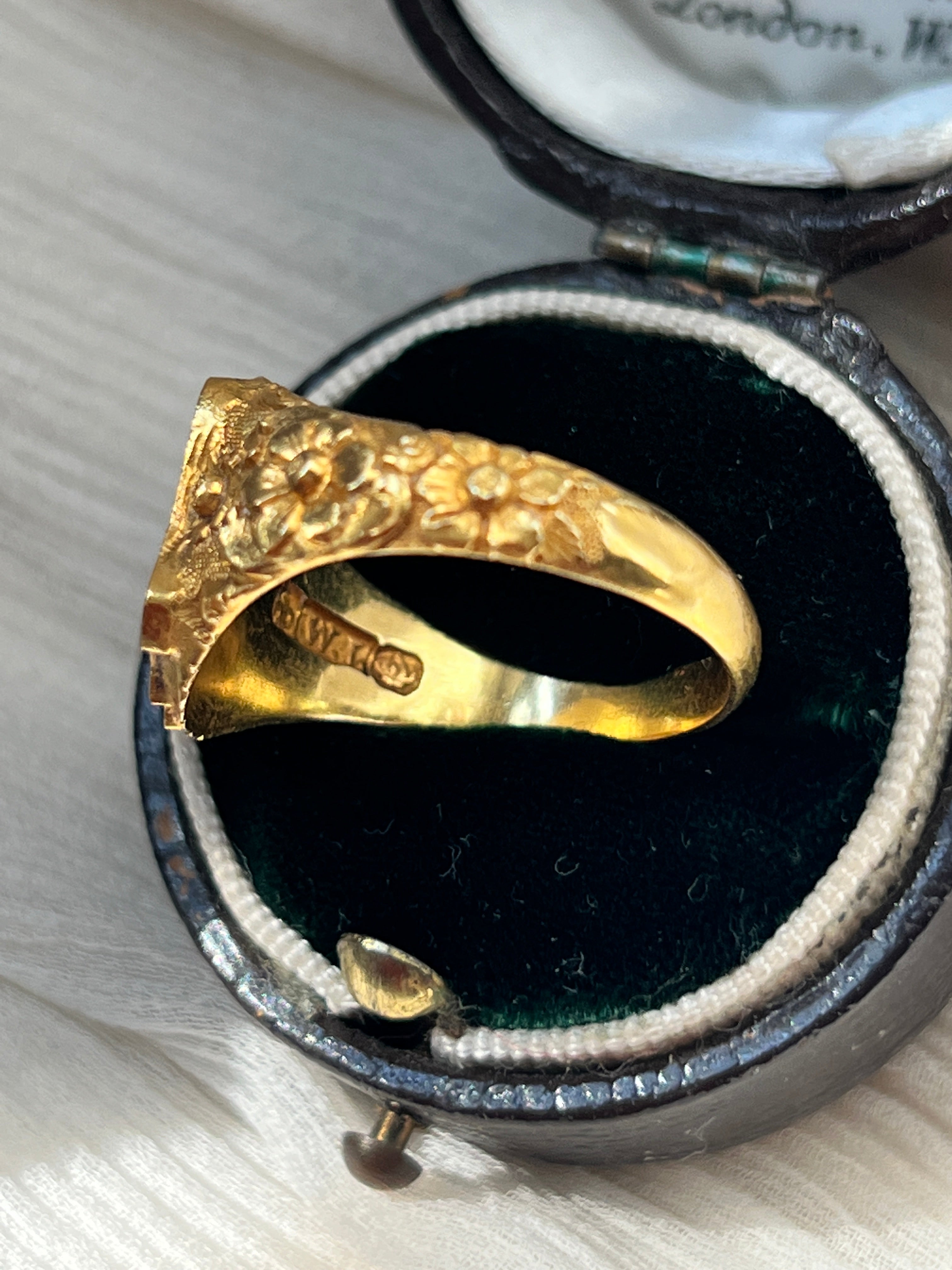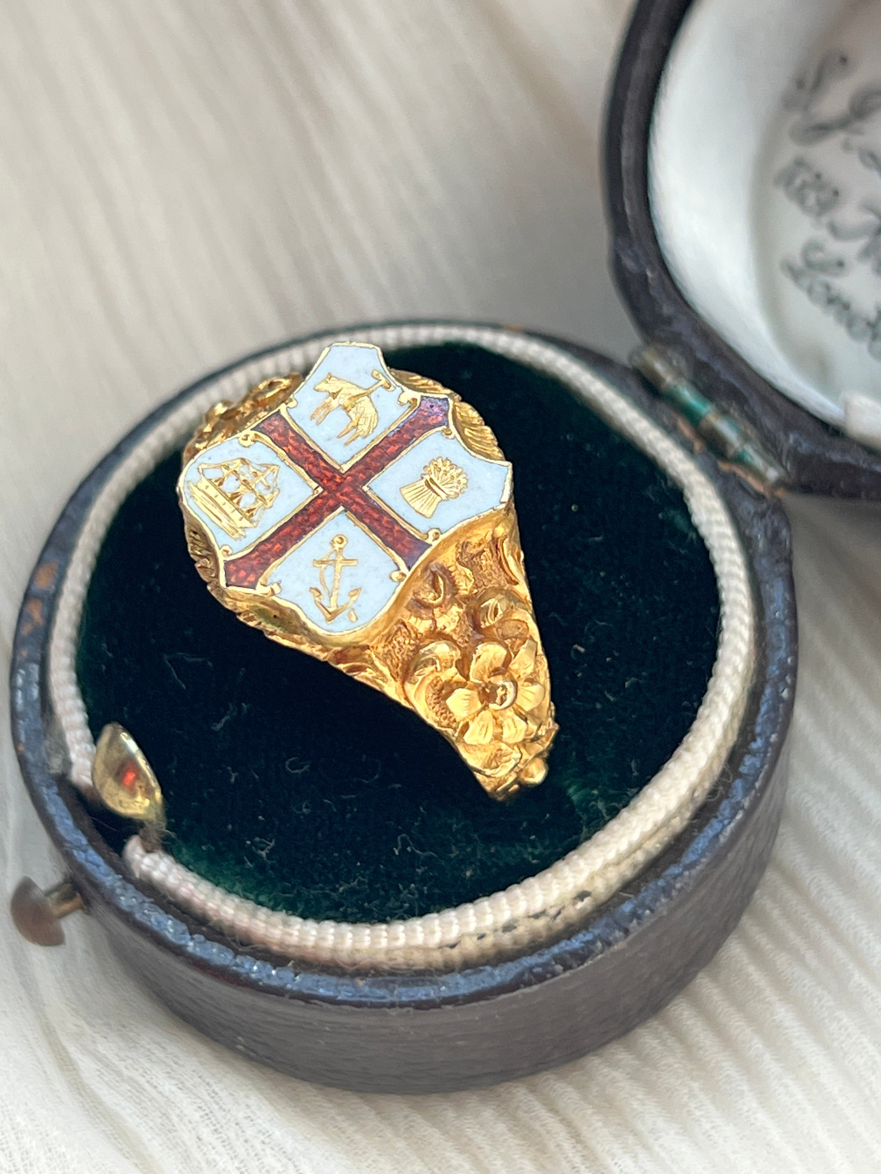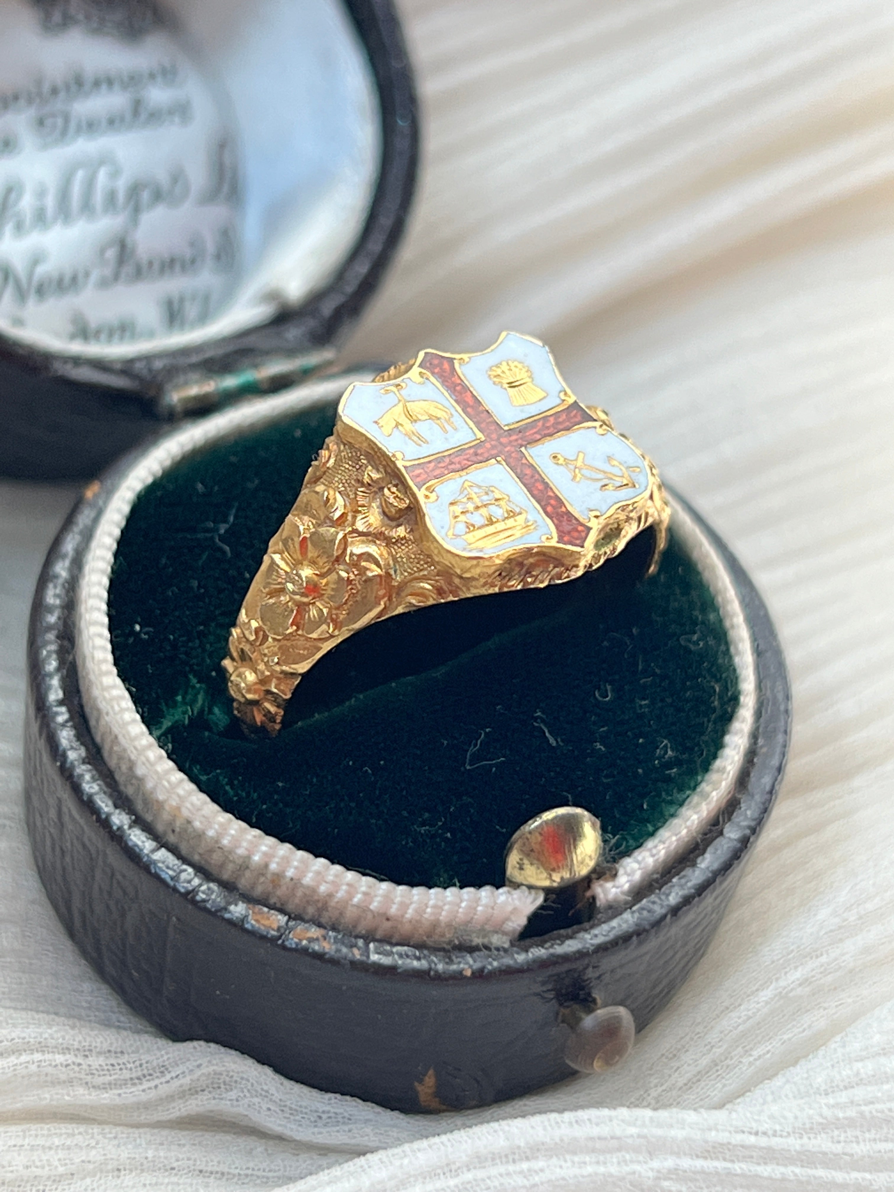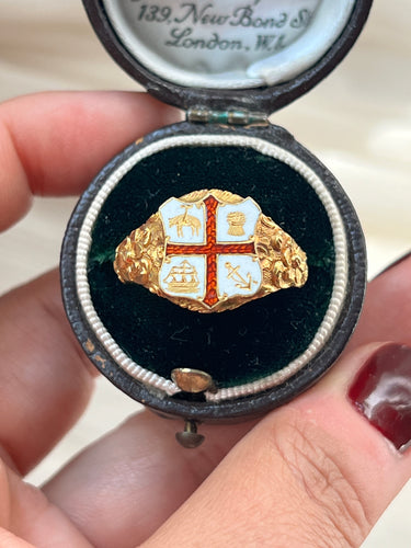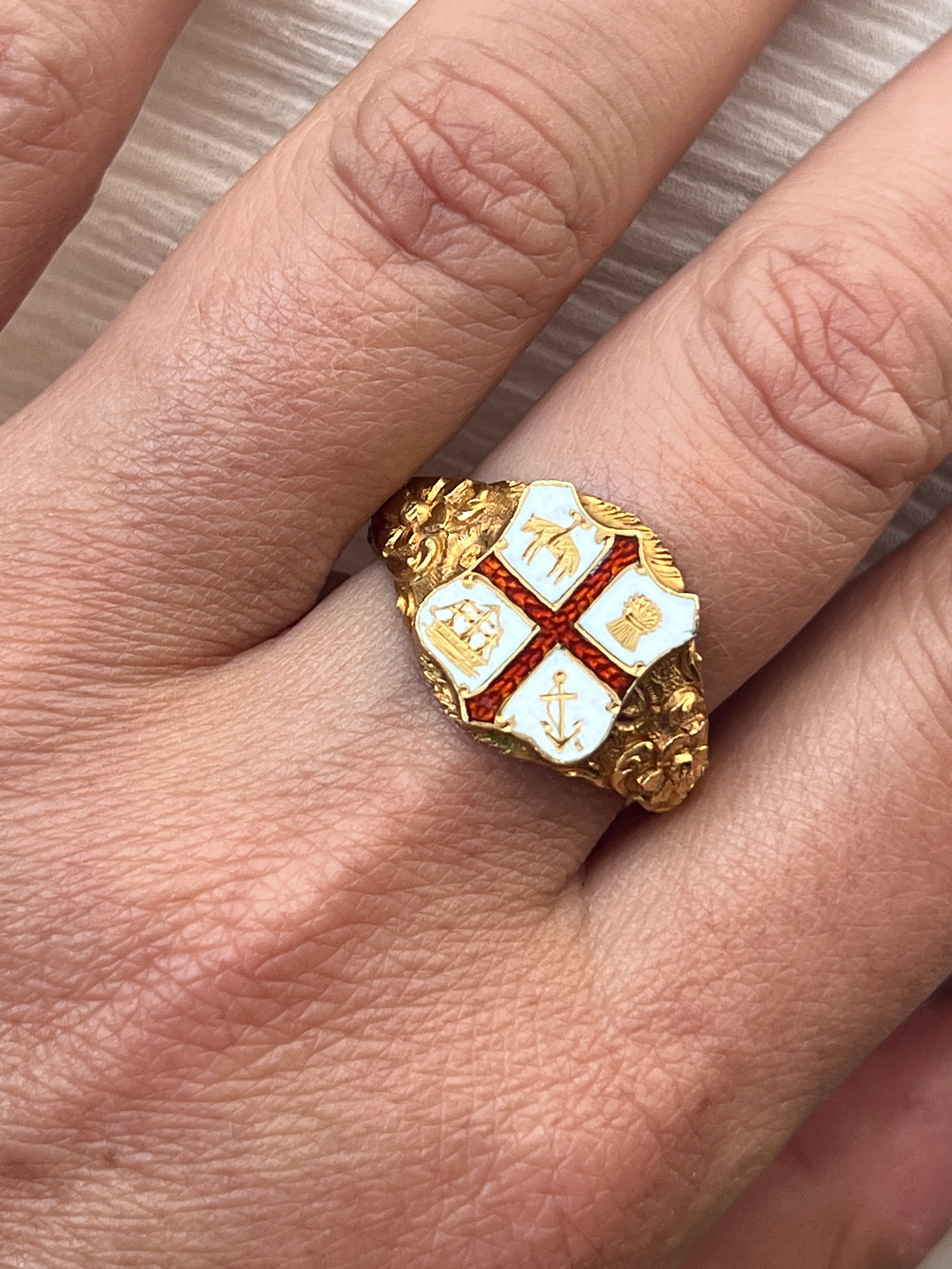 The work on this antique treasure is so wonderful. Antique English, crafted in 15k gold with white, red & gold enamel shield shape ring. It features a cross in red enamel in the middle with four design in each section featuring a boat and an anchor. The gorgeous flower engraving design on both side is wonderful.