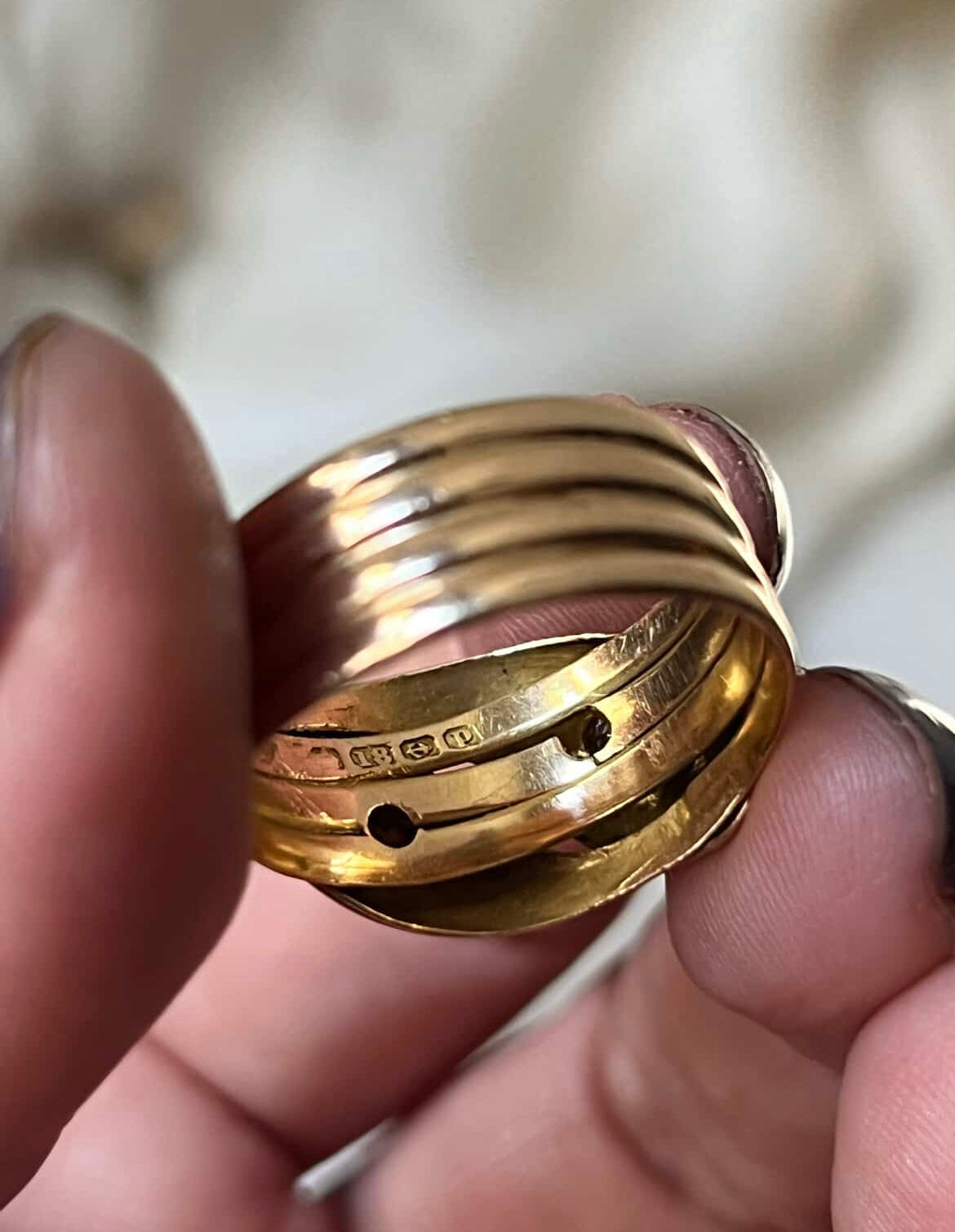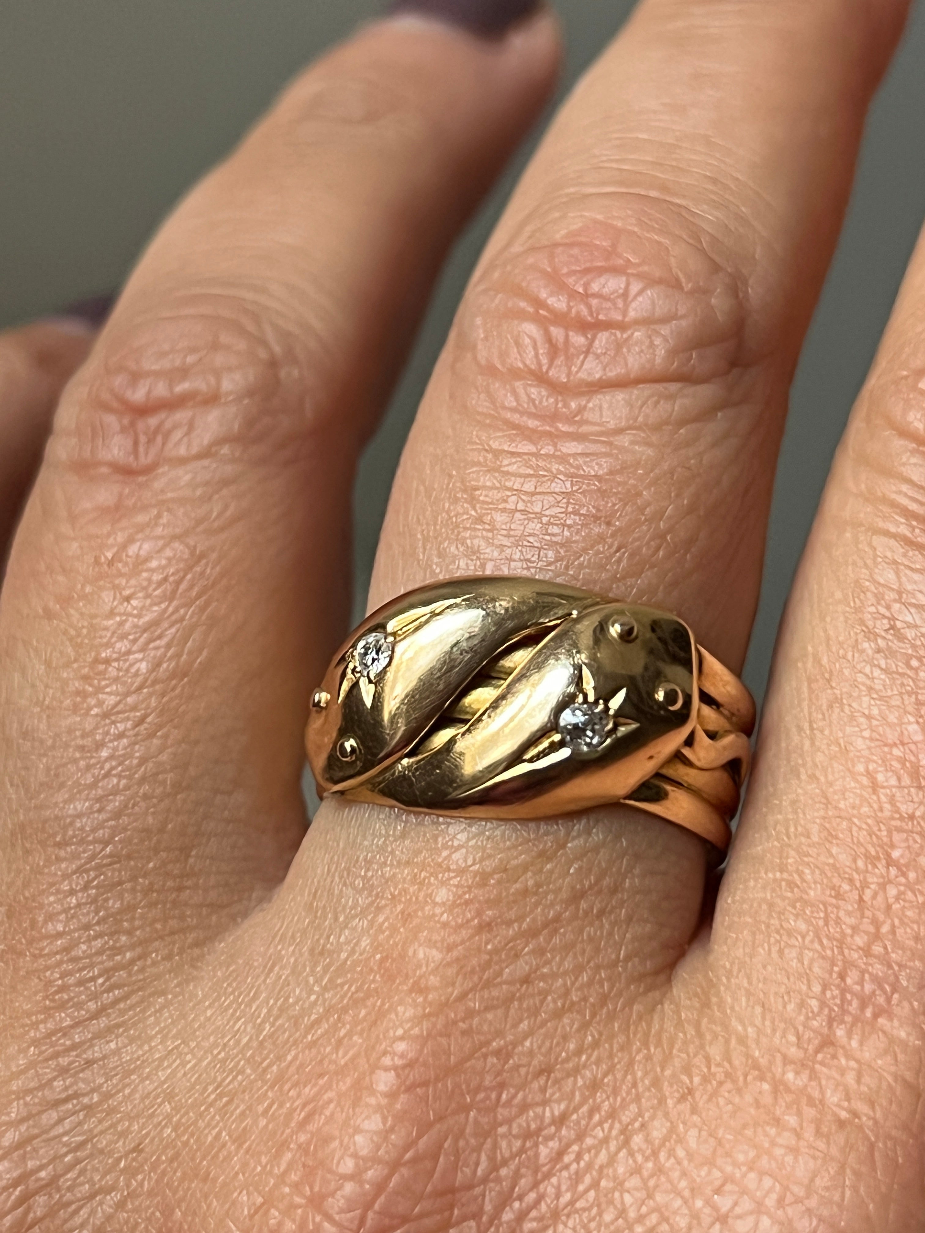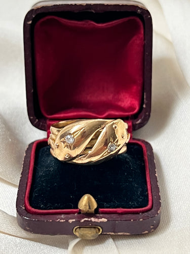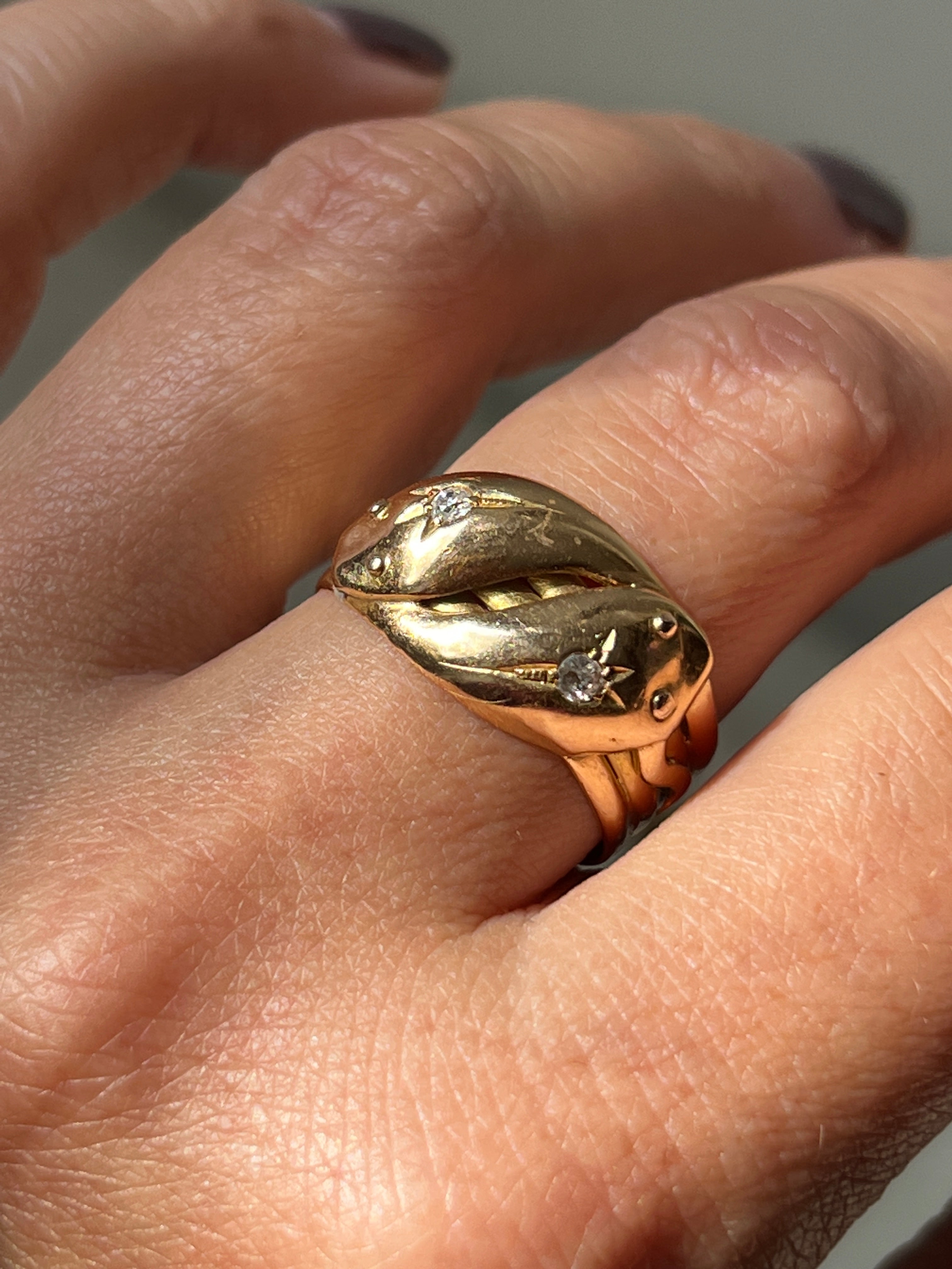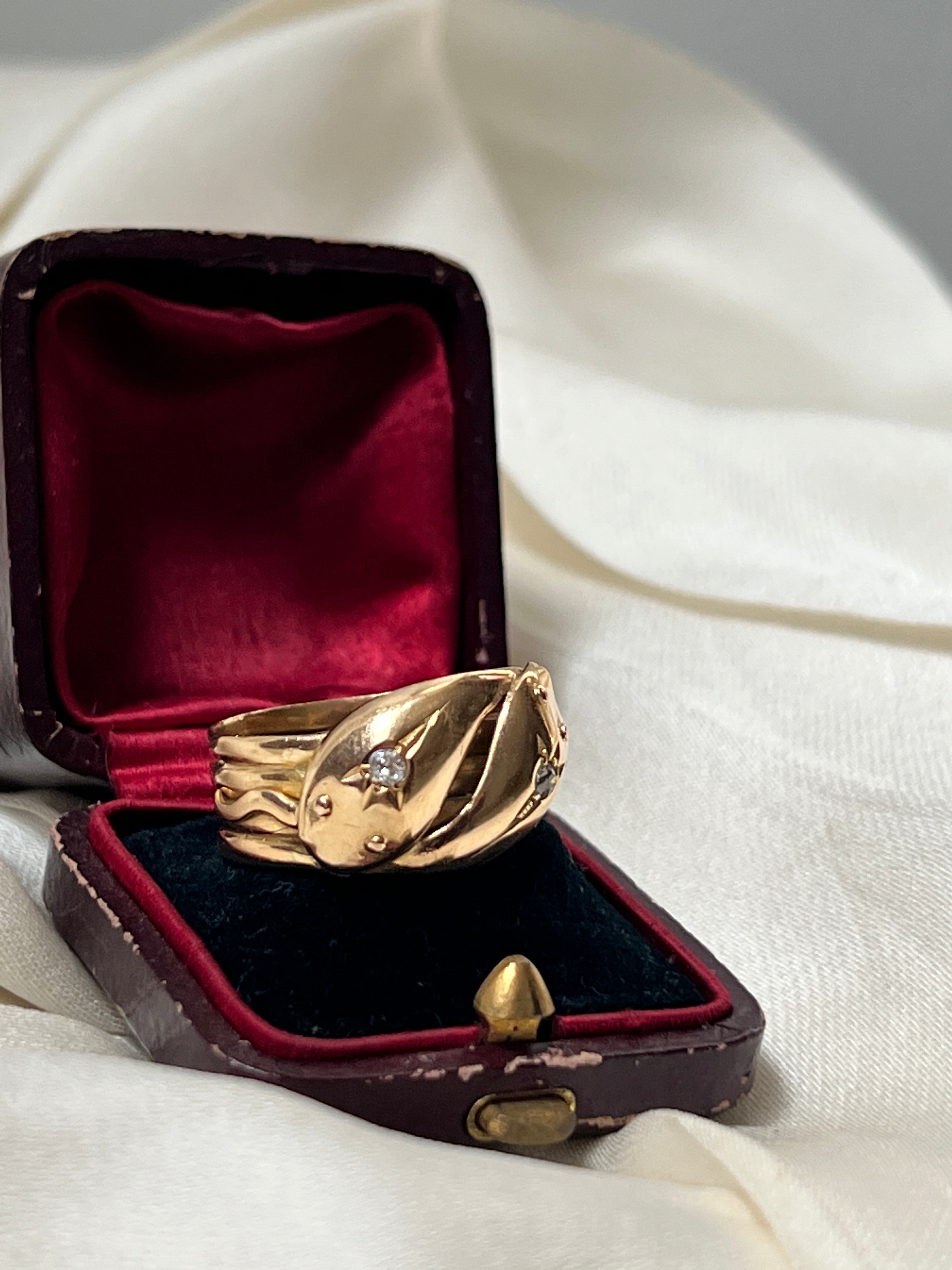 Beautiful English Antique 18k gold snake ring with two old cut diamond. The ring is fully hallmarked. Lovely details with tails on the side.