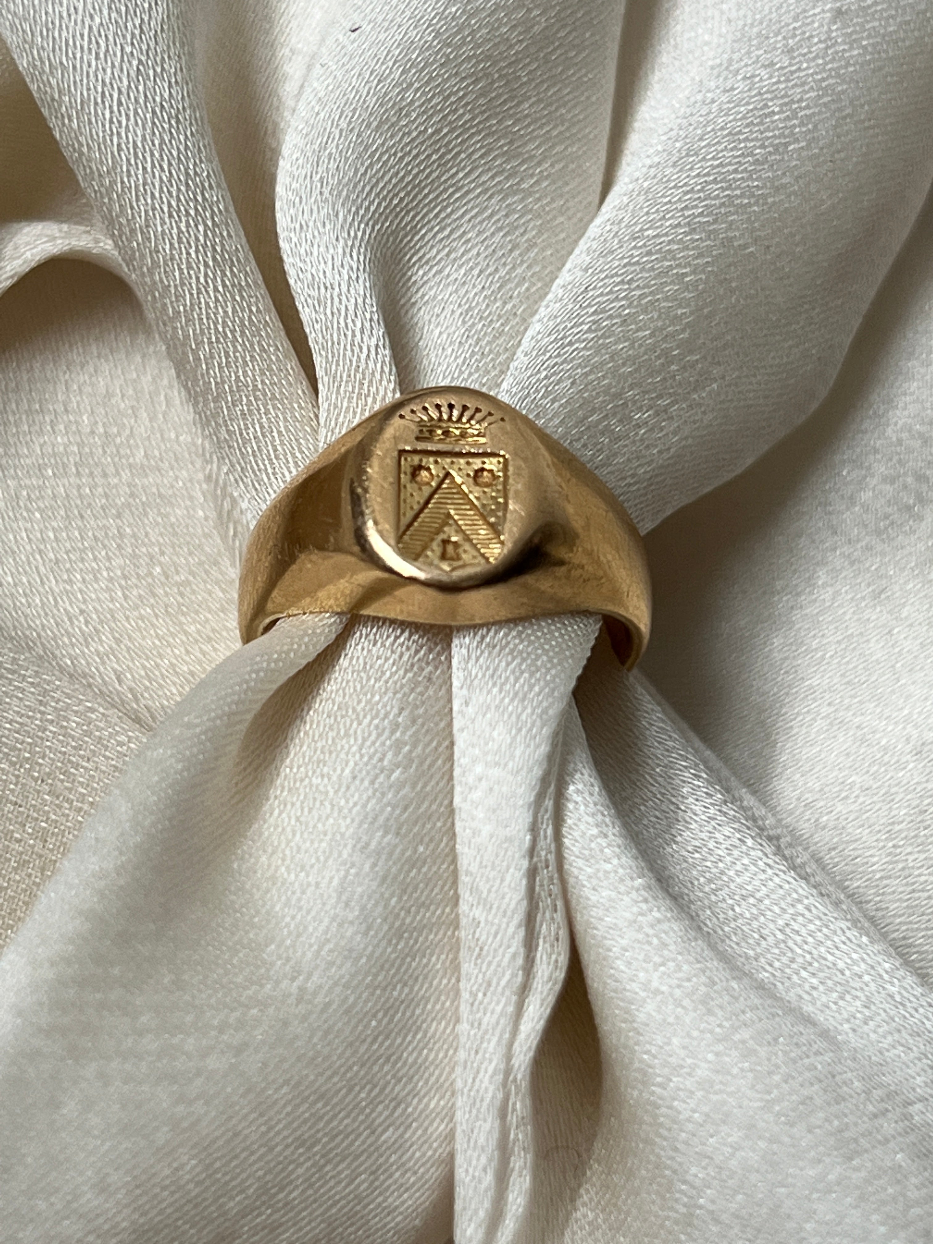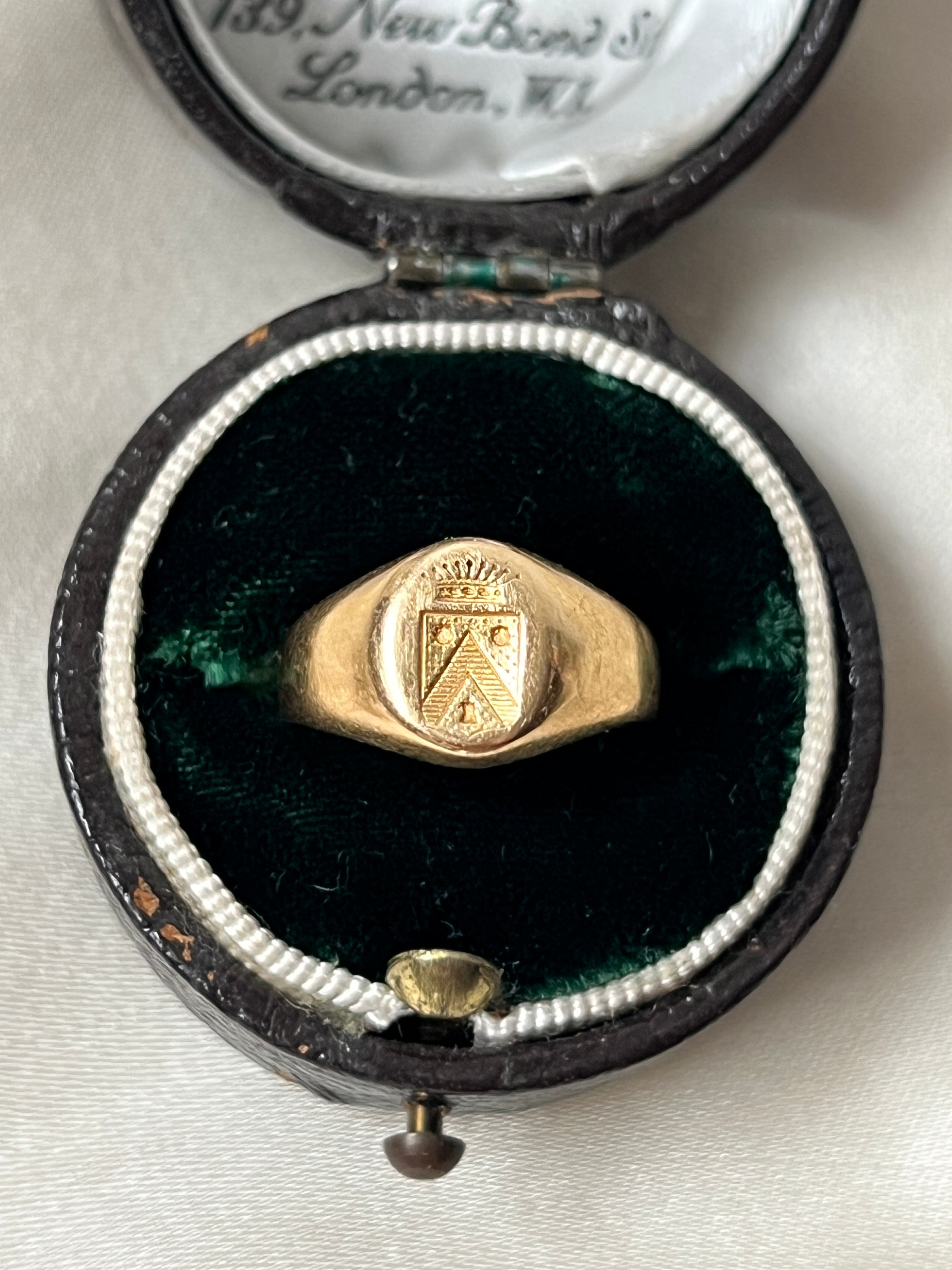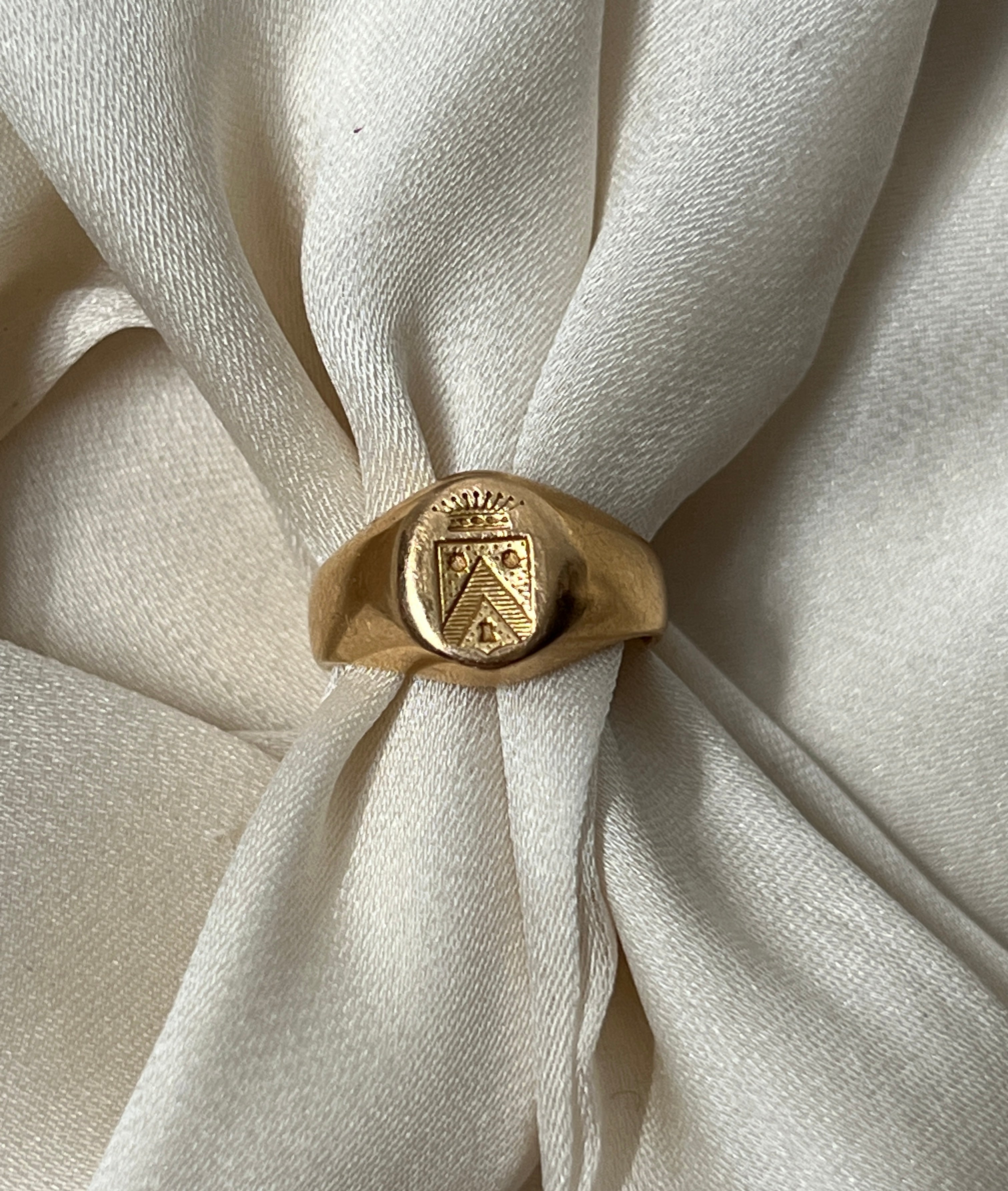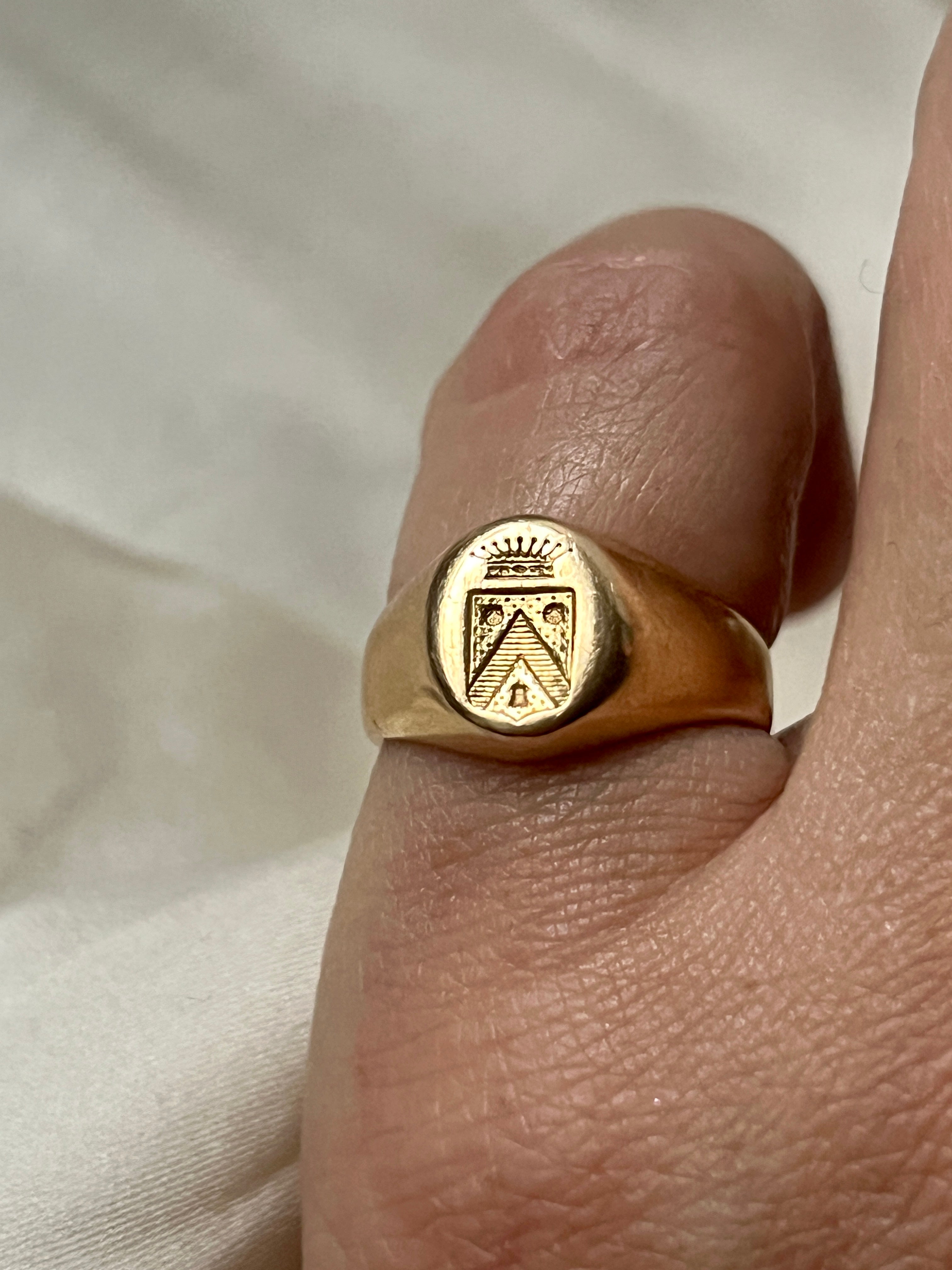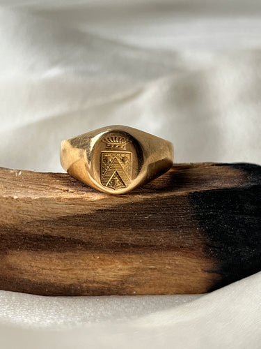 Antique French 18k gold signet ring featuring a family crest with a nine pointed crown. The ring is beautifully engraved and has a gorgeous patina. It is hallmarked with an eagle's head. It makes a perfect pinky ring.