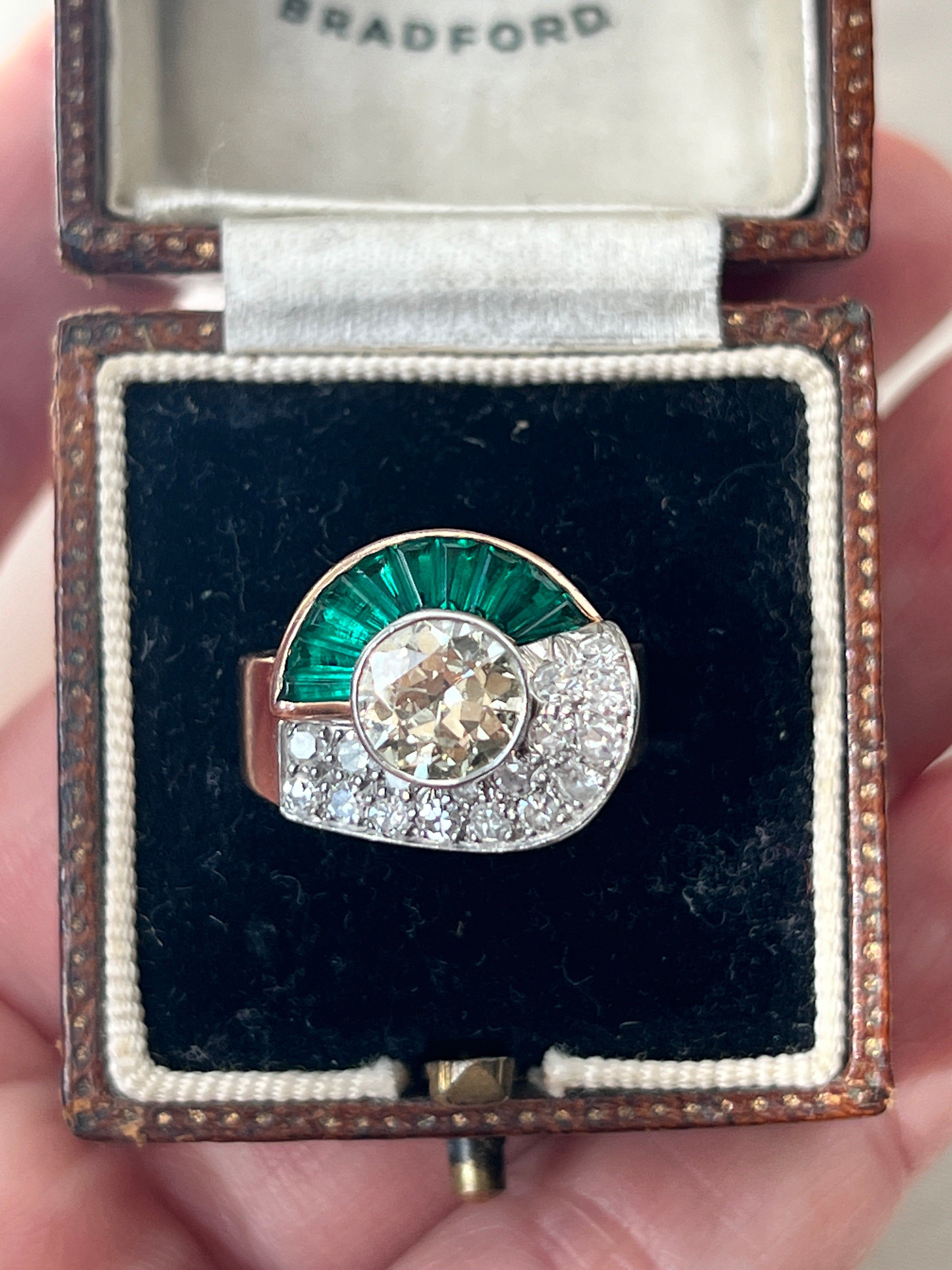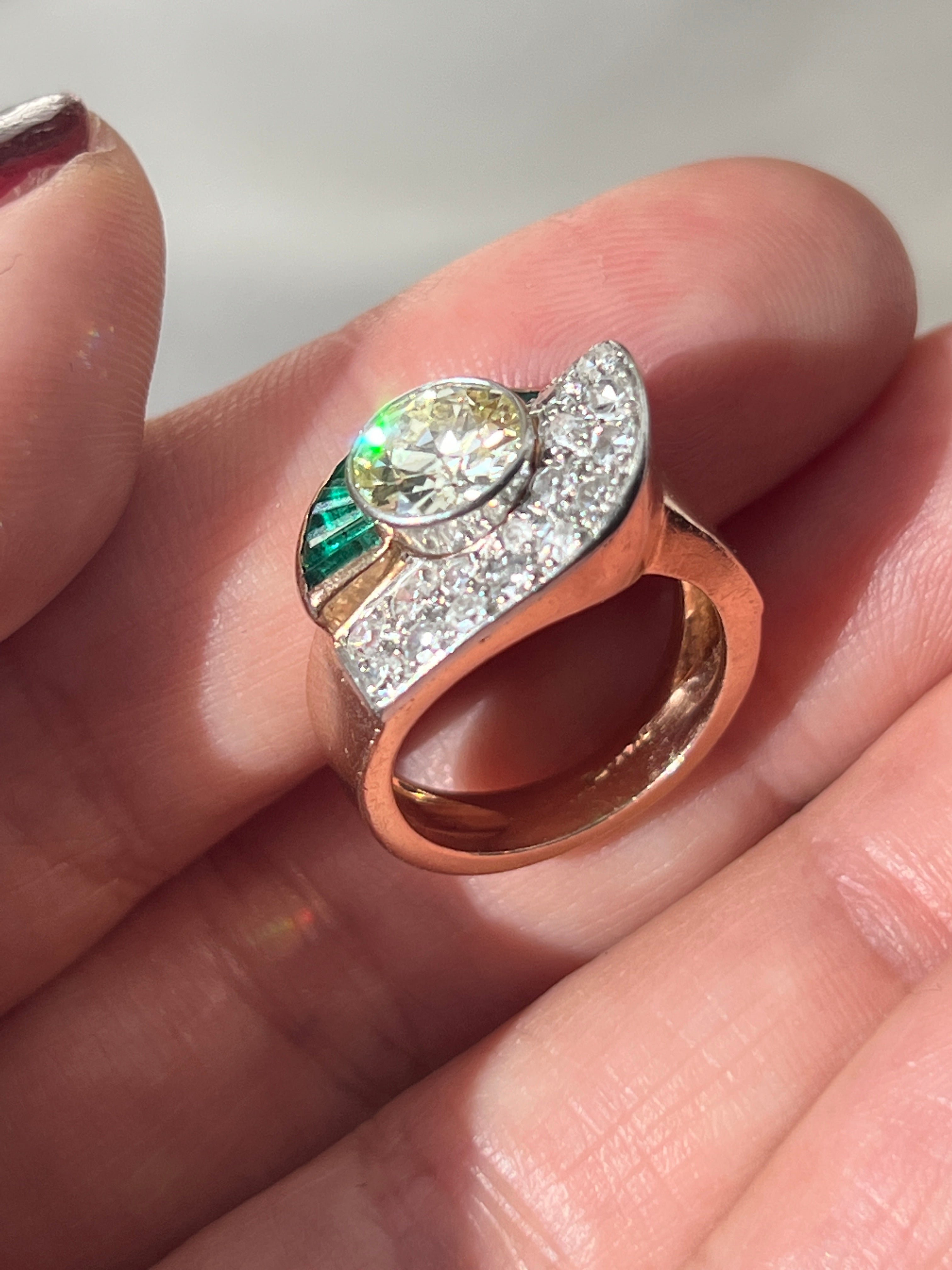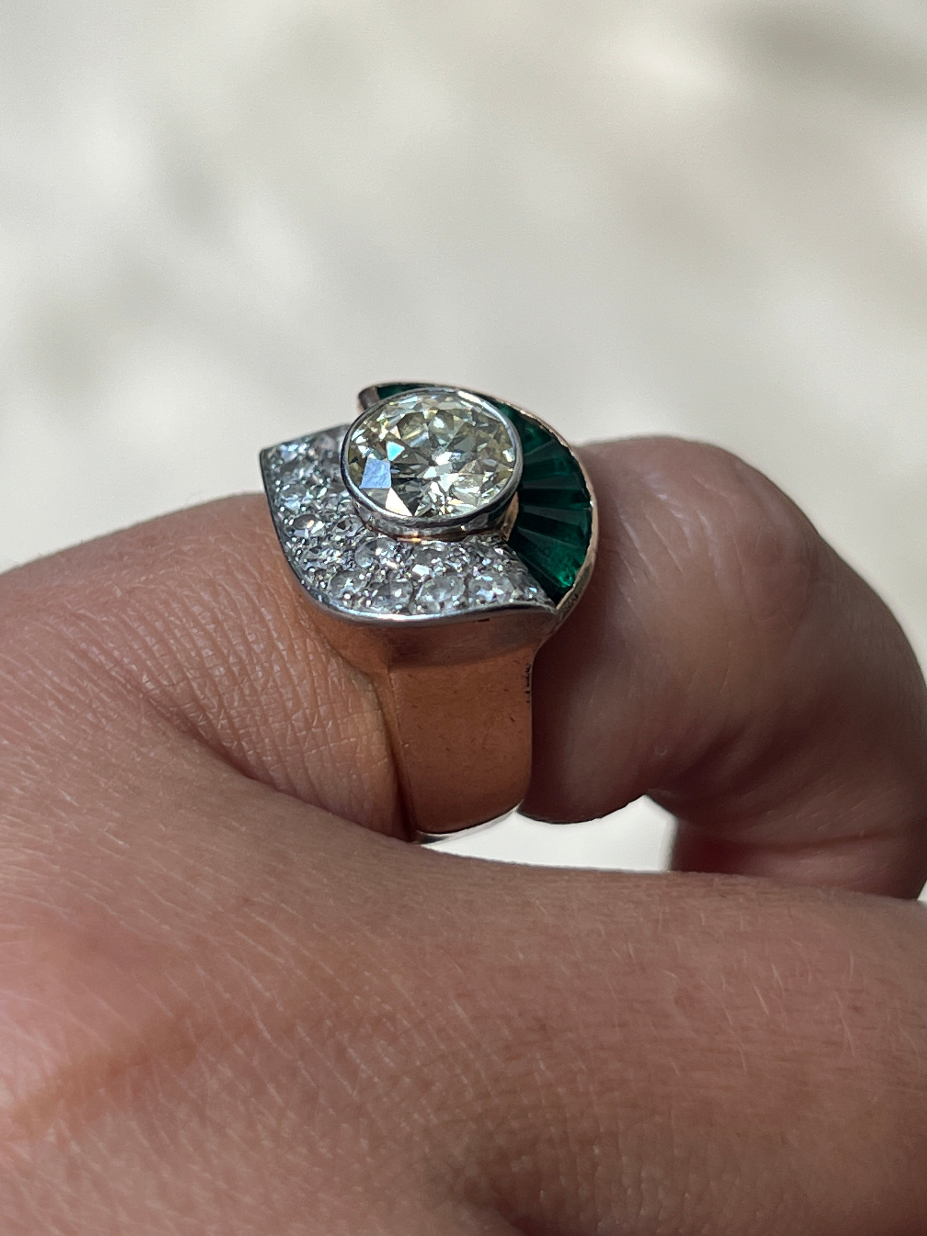 Beautiful Art Deco 18k gold emerald & diamond ring. The ring features a central natural diamond of 1.5/1.75 ct, natural baguette cut emeralds and brilliant cut diamonds.