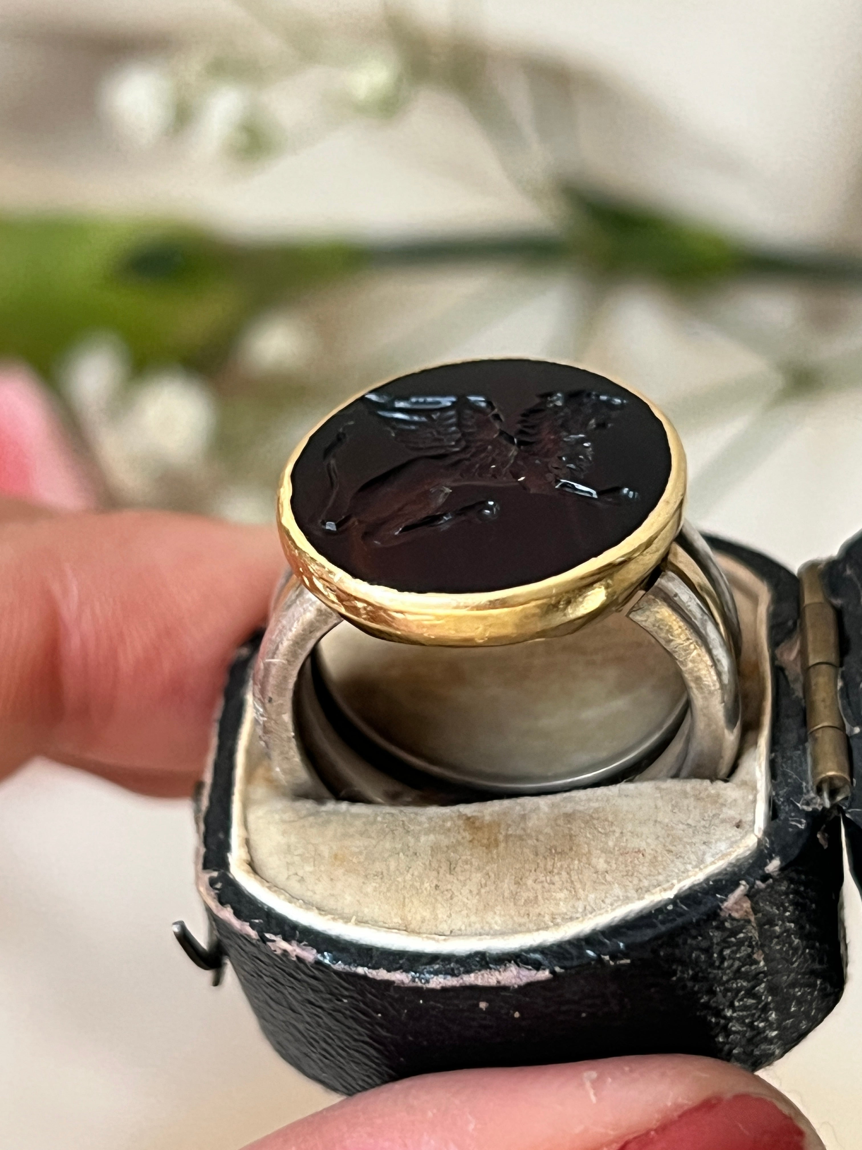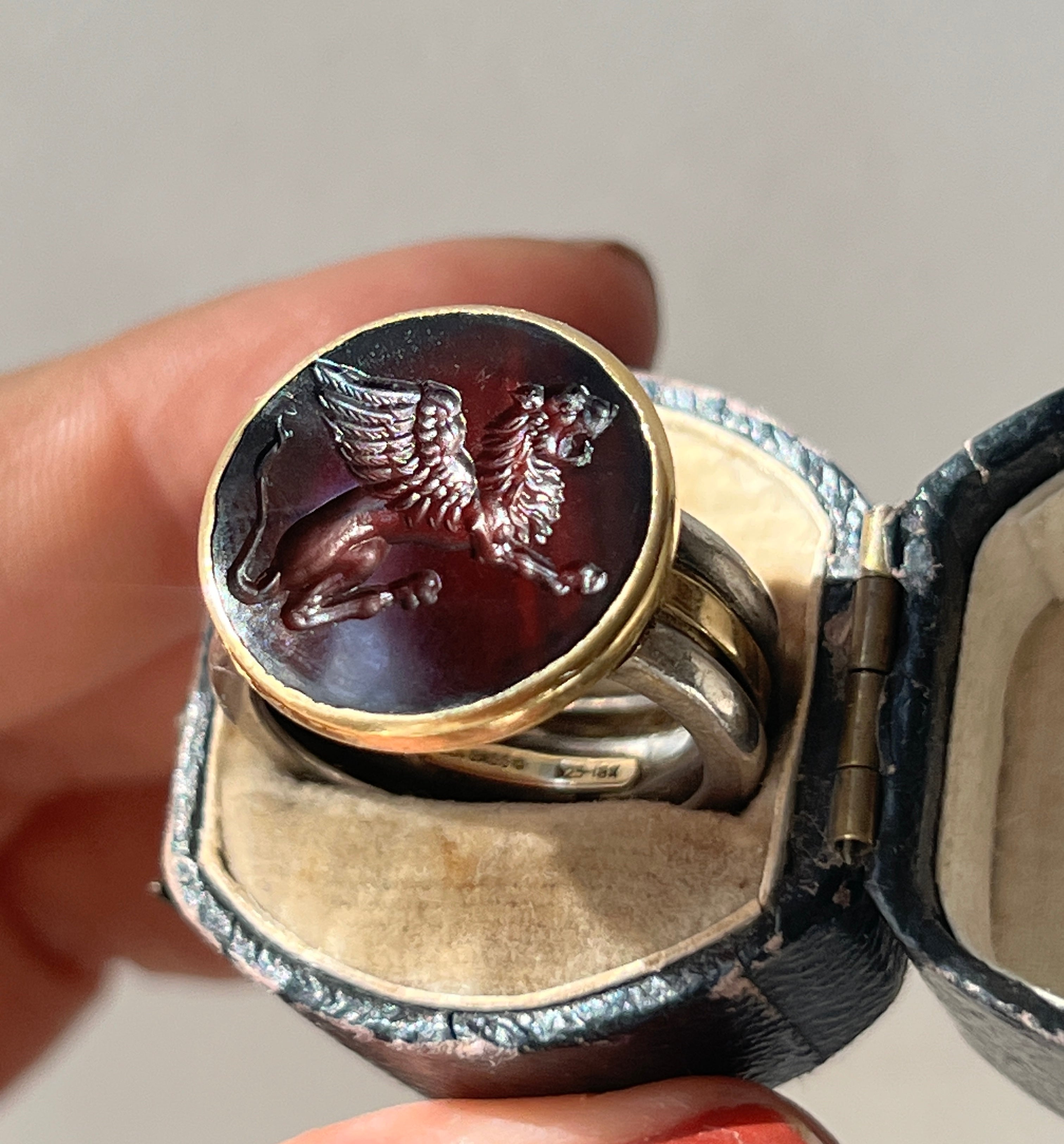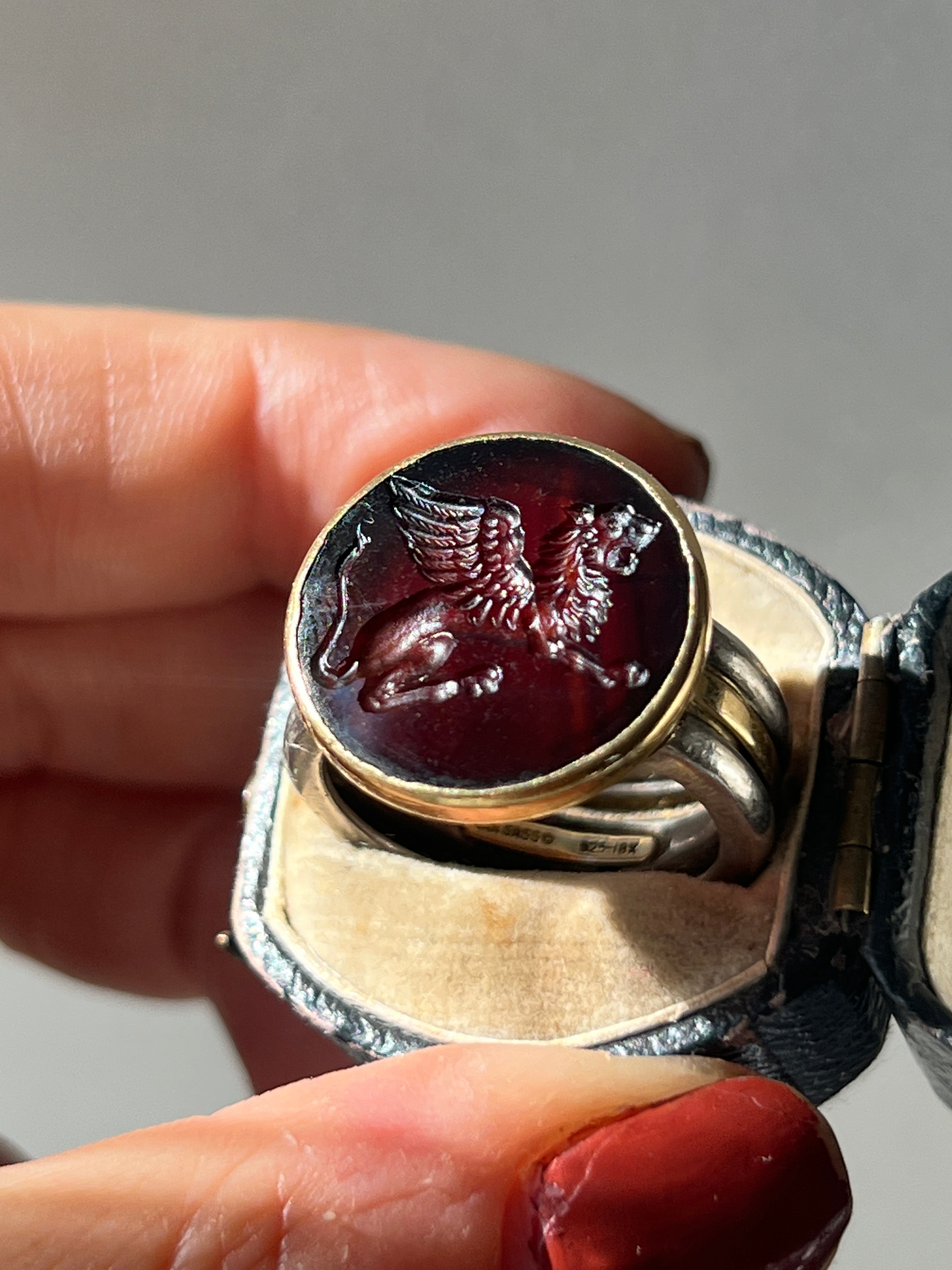 Vintage 18k gold, silver carnelian intaglio with a winged lion