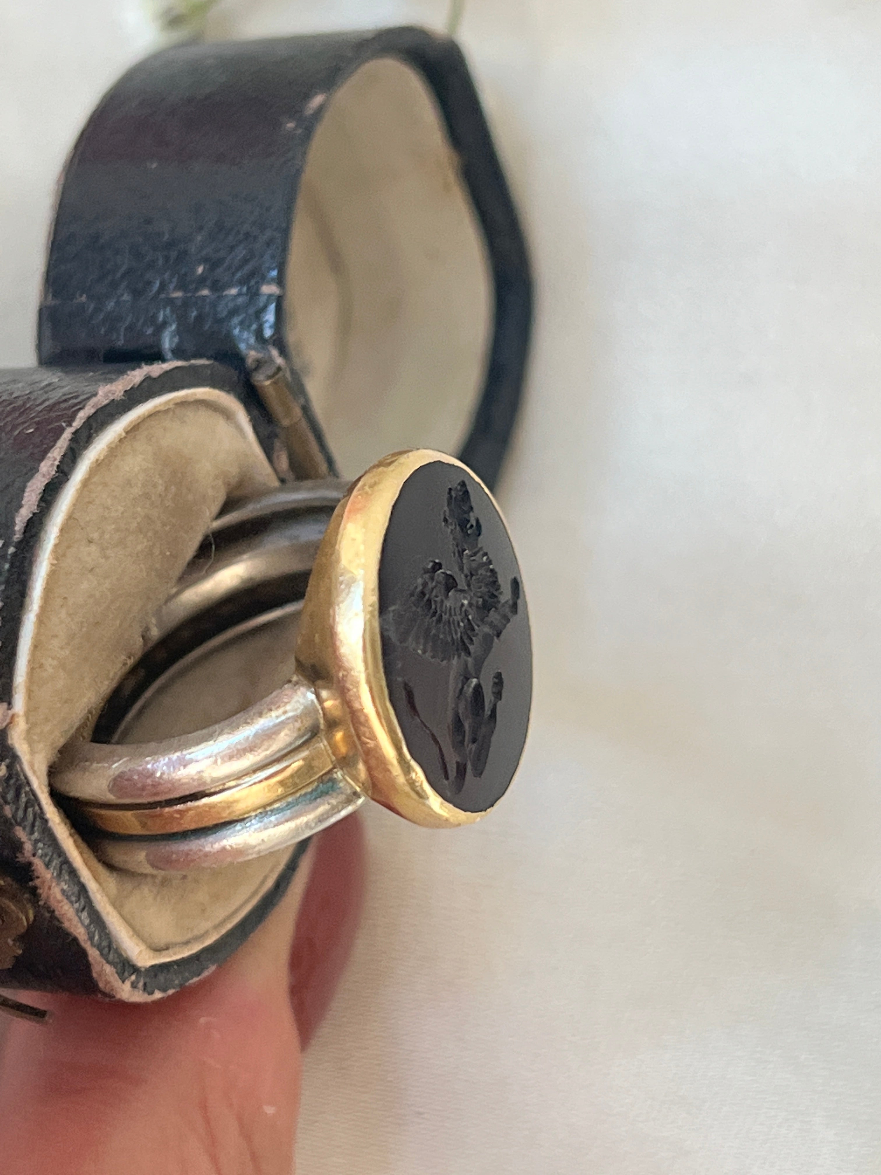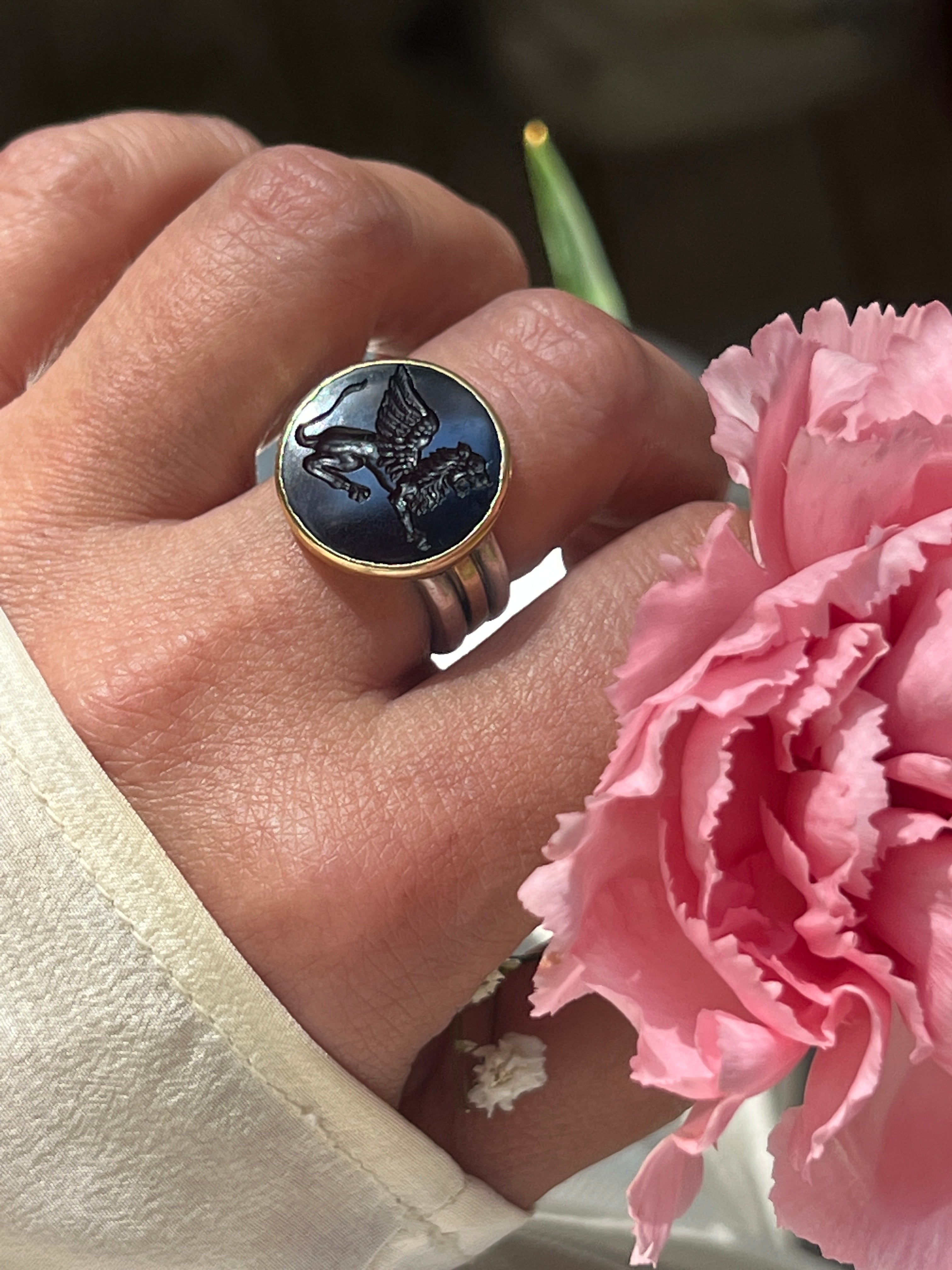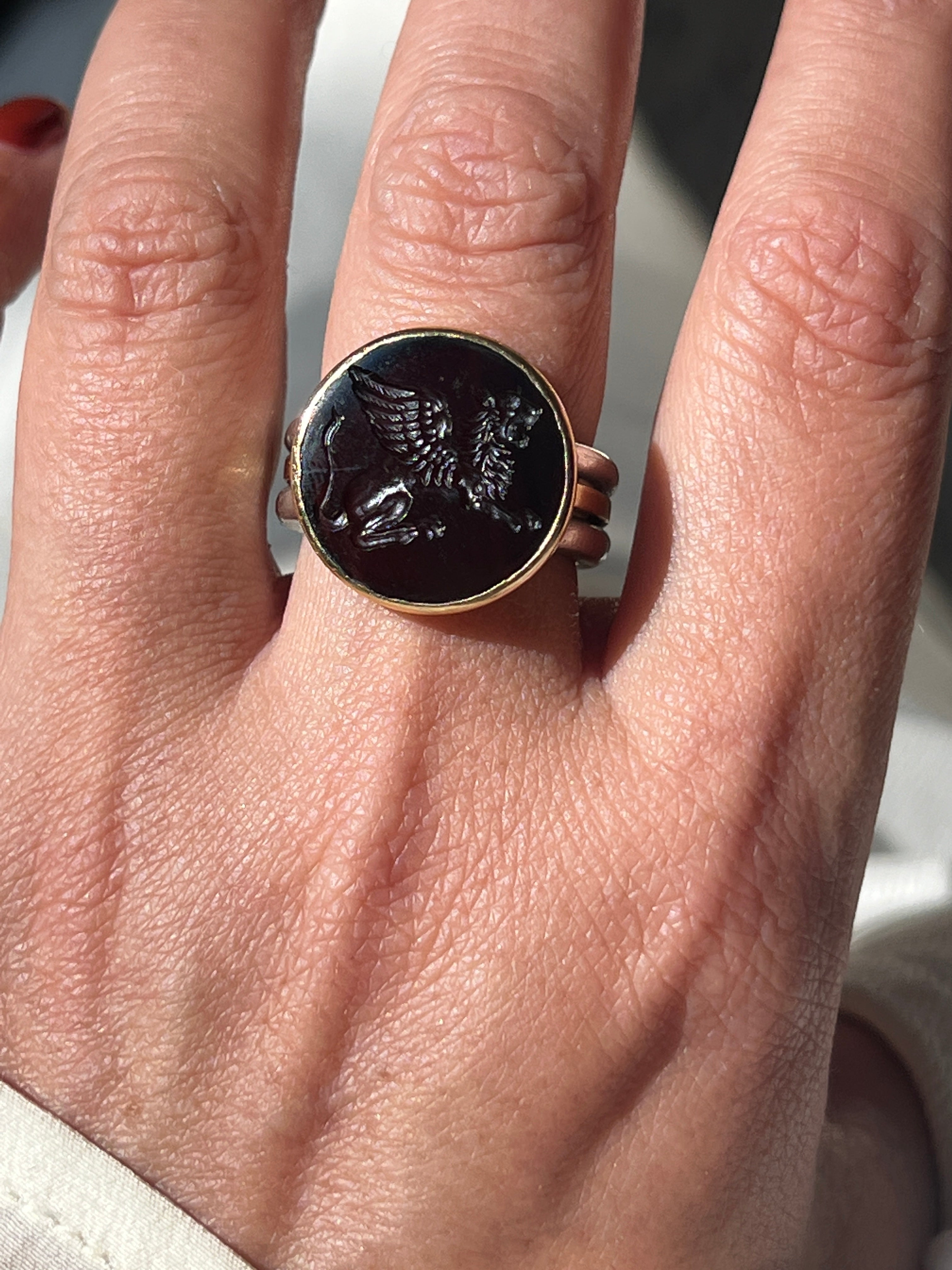 Vintage 18k gold, silver carnelian intaglio with a winged lion
